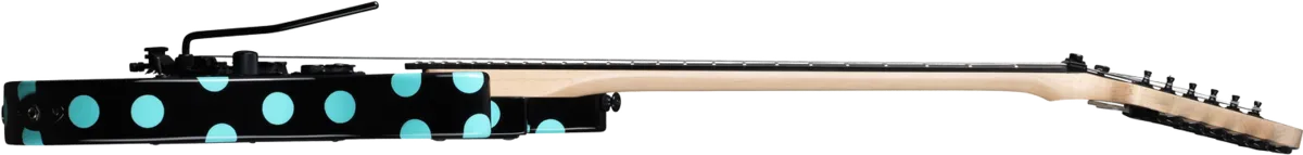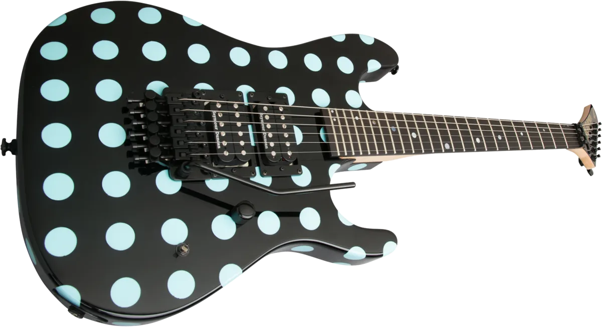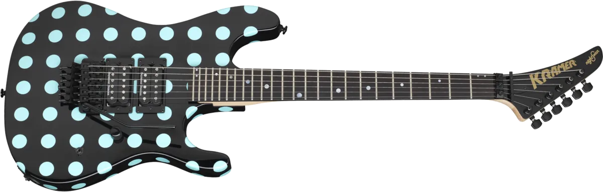 The Kramer Nightswan was first released in the late 1980s and quickly became a Kramer classic. The new Nightswan features a double cutaway Mahogany body in an Ebony finish with blue polka dots. The bolt-on 3-piece Hard Maple neck has a “C” profile with an Ebony fingerboard, a 24.75" scale, medium jumbo frets, a 16" radius, a Floyd Rose® RS Lock Nut, and pearloid inlays in a unique wave pattern. The traditional Kramer headstock has the original ‘Nightswan’ logo.