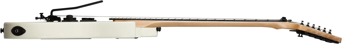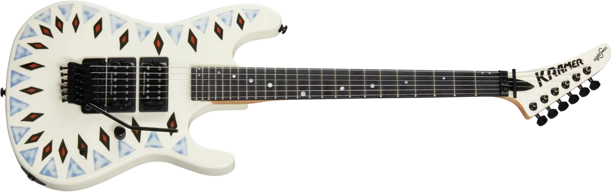 The legendary shred sled from the late 80s returns to the Kramer lineup. Featuring a double-cutaway mahogany body with a deep cut lower horn for exceptional upper-fret access, the NightSwan™ is propelled by two Seymour Duncan® JB™ humbucking pickups and is ready for deep swoops and dives with its Floyd Rose® 1000 Series tremolo and R2 locking nut. The ebony fingerboard has a 16" radius and features 24 jumbo frets and "ping pong" pearloid dot inlays, while the back of the slim, C-shaped 3-piece hard maple neck is satin-finished, which makes it perfect for lightning-fast licks. This 'Swan is finished in Vintage White with the rare and highly desirable Aztec Graphics.
