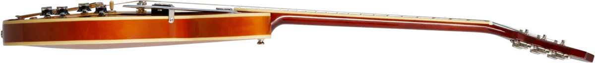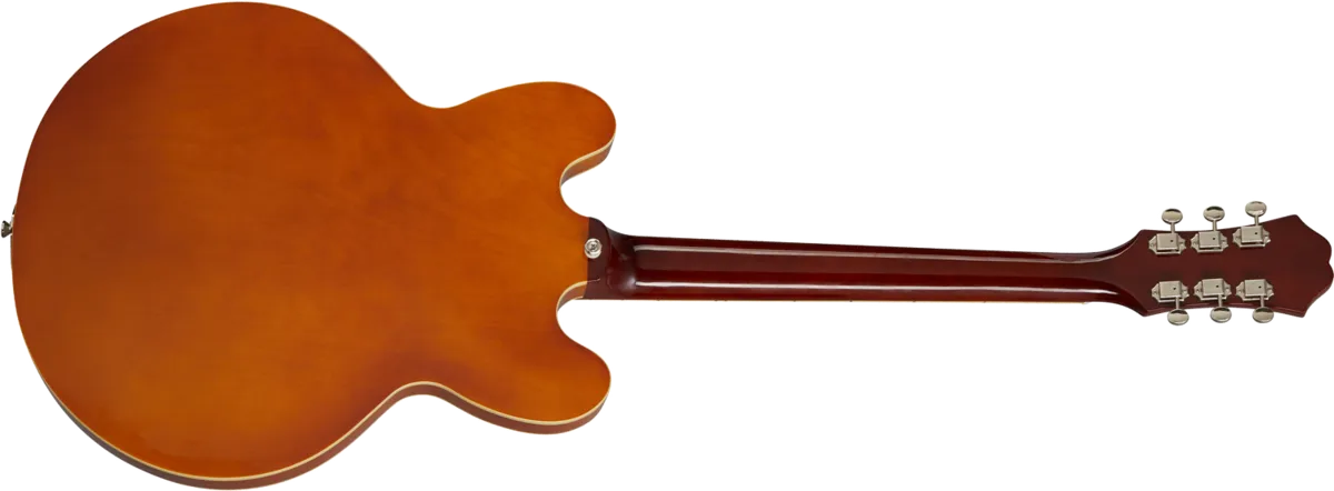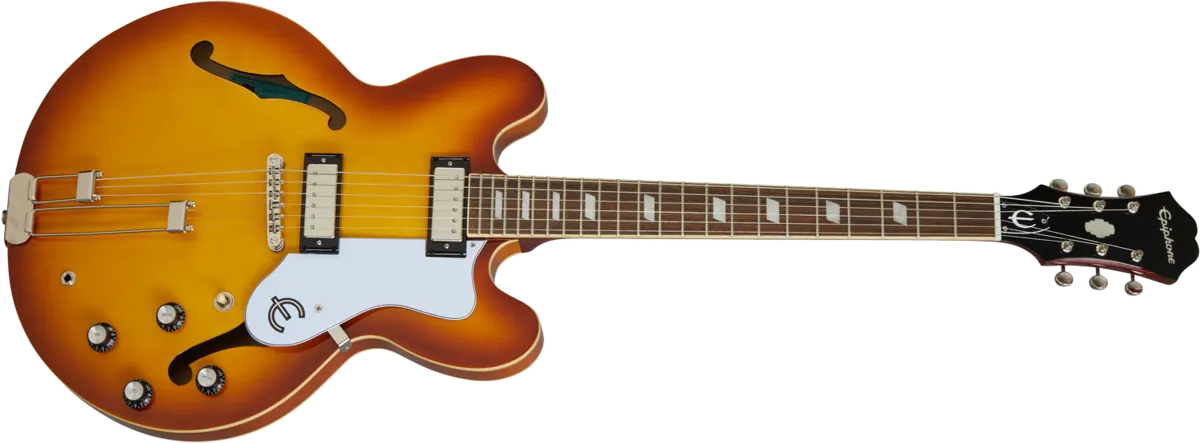 The Epiphone Riviera, one of Epiphone’s original, most enduring classics makes a comeback! First introduced in the early ‘60s, the Epiphone Riviera’s semi-hollow design has been a favorite of players from all genres and generations including blues greats Robben Ford and Otis Rush, Lou Reed of the Velvet Underground, and The Strokes’ Nick Valensi, who have all found that the Riviera’s legendary ES™ body shape can produce great tones with any pickup variation. This Riviera features a layered maple top back and sides, a 3-layer pickguard with the classic metal Epiphone “E”, and comes equipped with Epiphone's LockTone™ Tune-O-Matic™ adjustable bridge and Frequensator tailpiece. Available in Royal Tan and Sparkling Burgundy full gloss finishes.