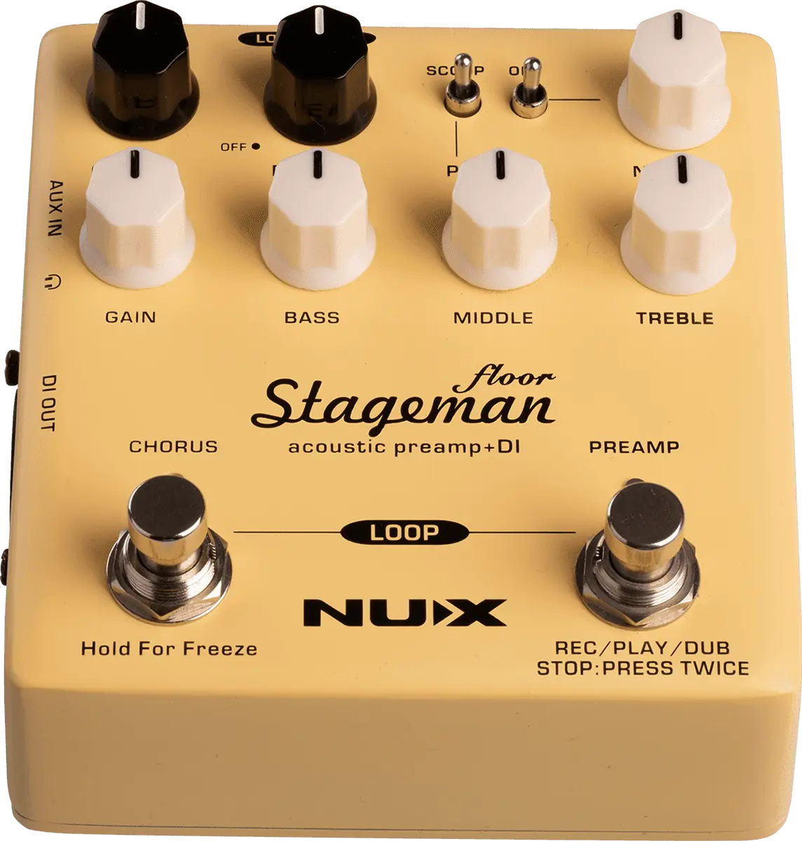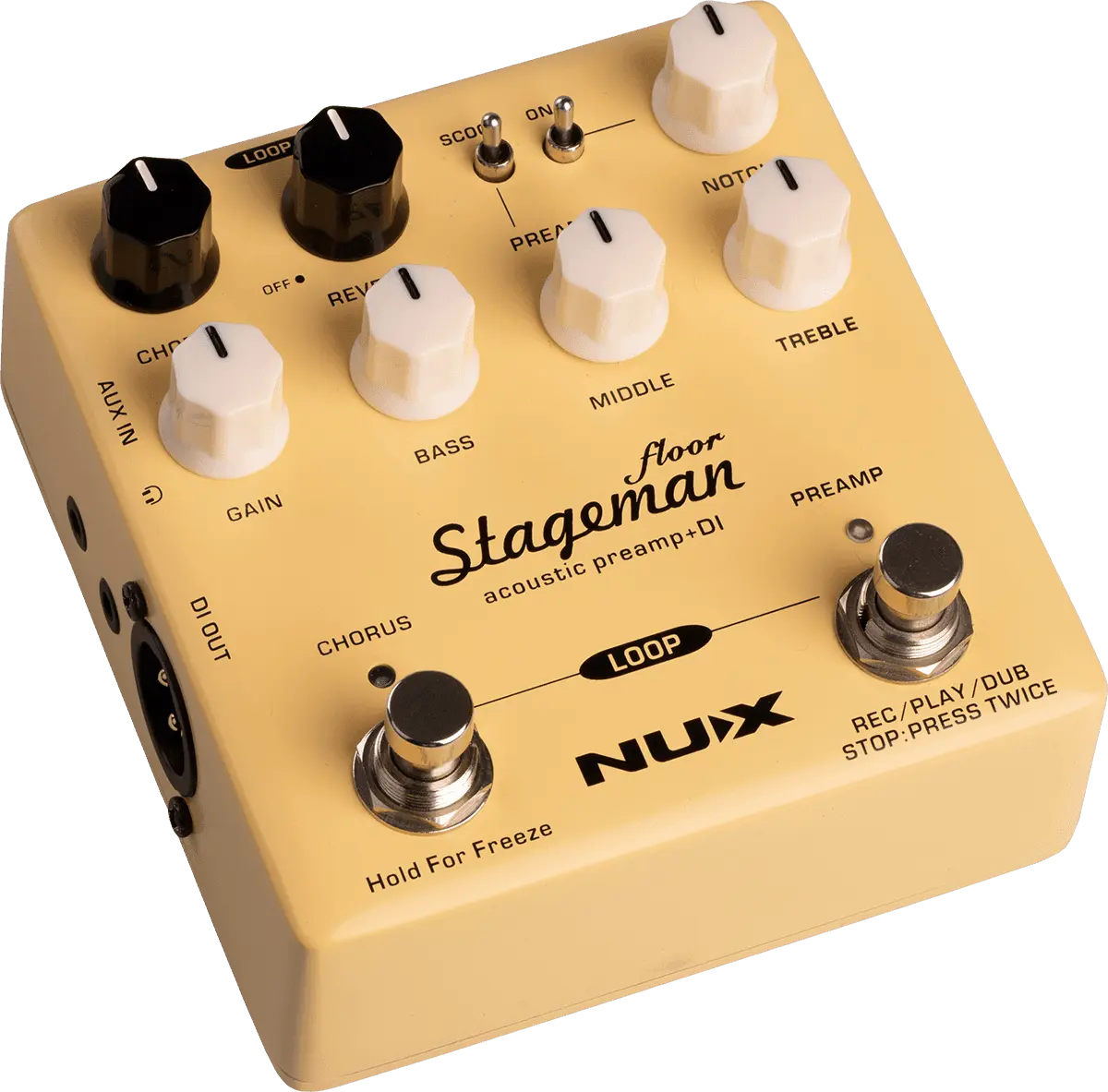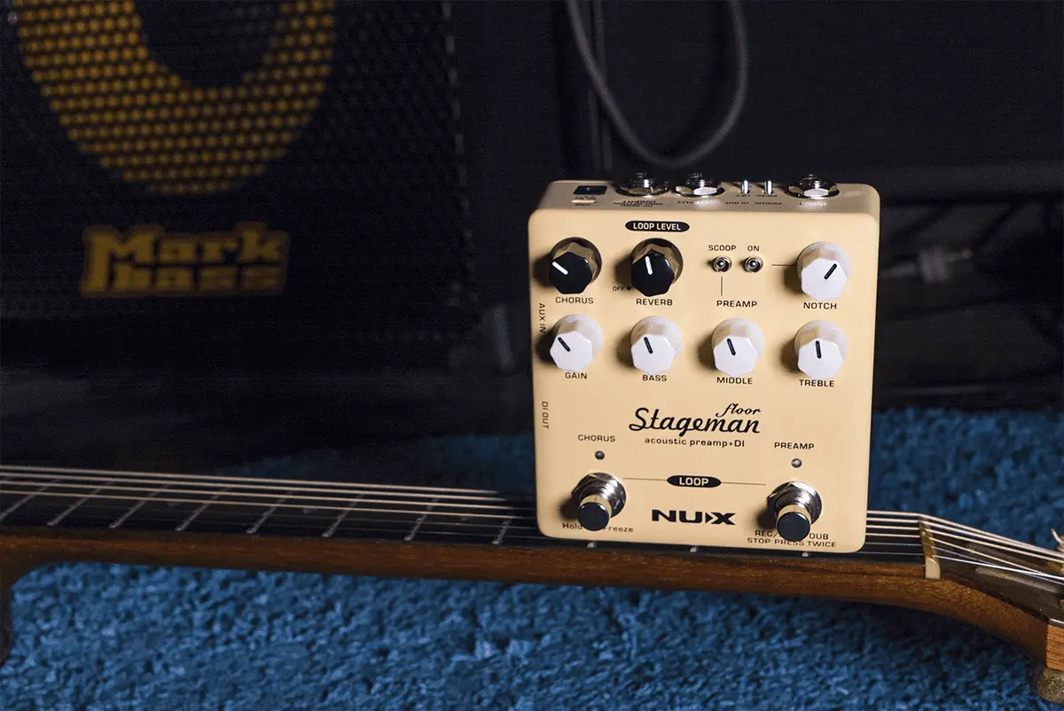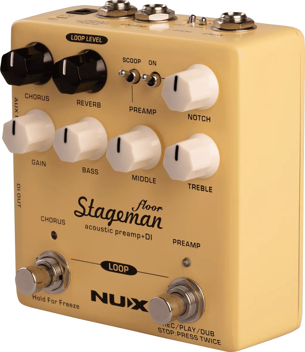 NUX Stageman Floor is an analog acoustic preamp with digital effects and looper function. It's a preamp, featuring a highly sensitive 3-band EQ with MID scoop toggle switch, an adjustable notch filter, and input gain control, provides ginormous headroom and delivers the sound all natural.