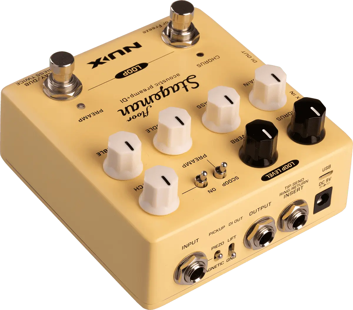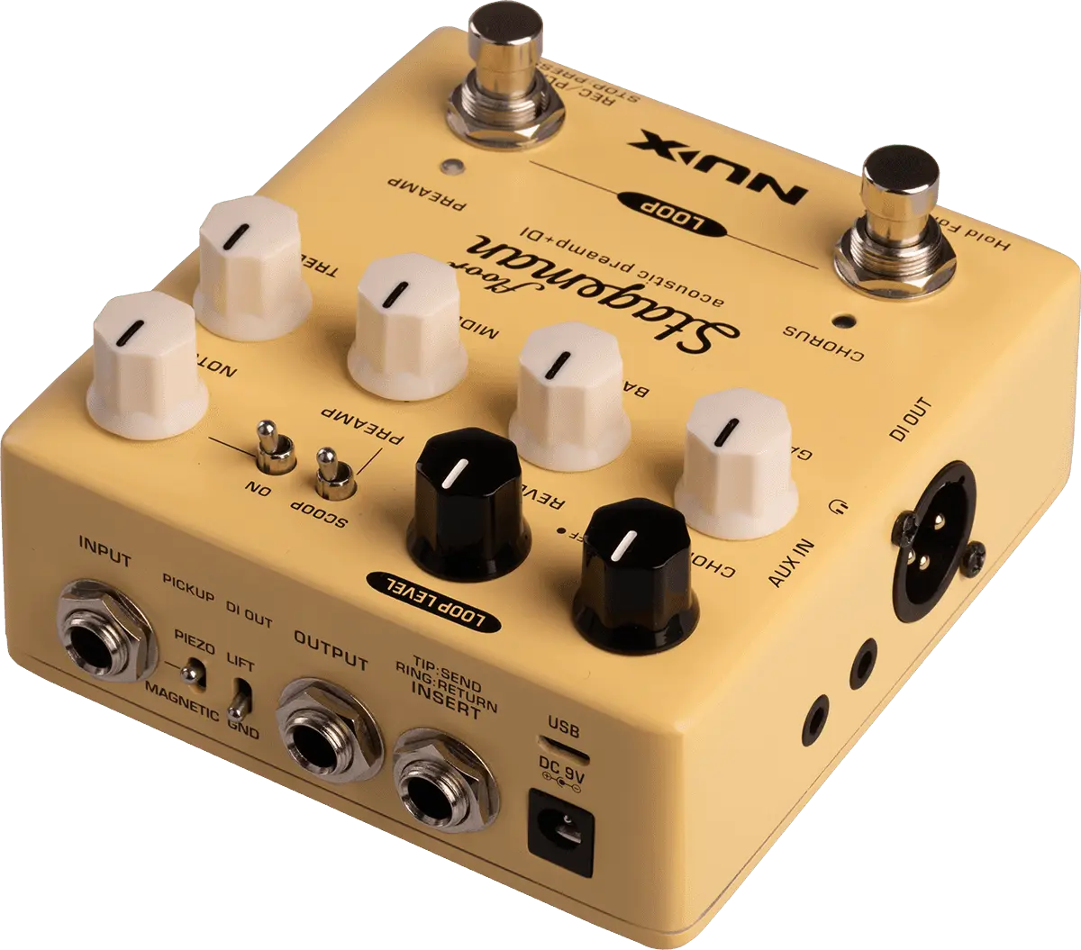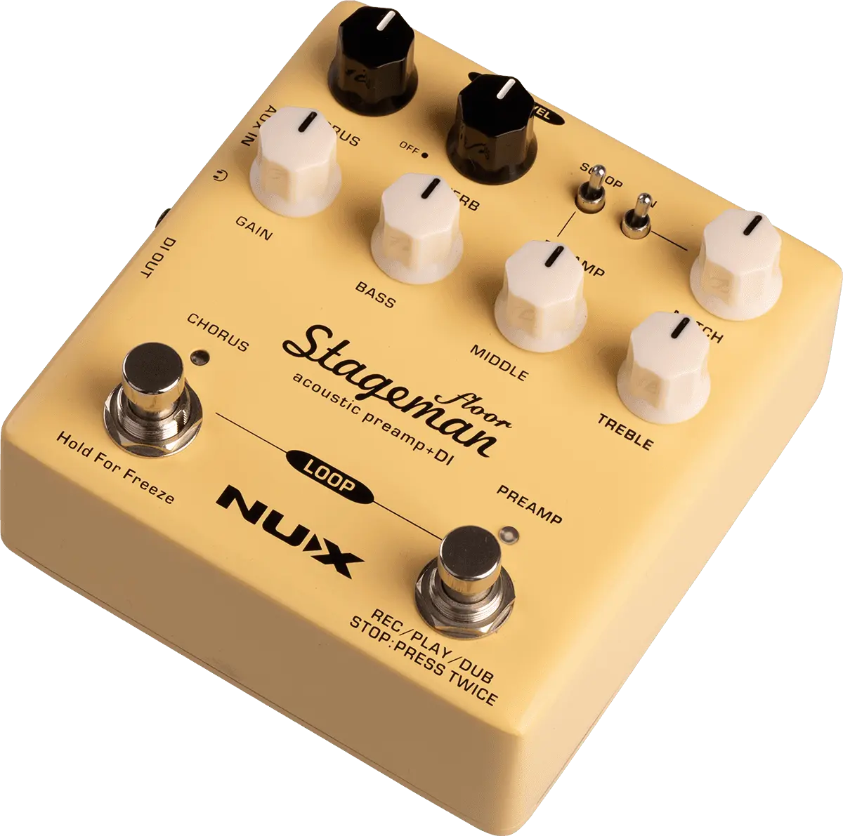 NUX Stageman Floor is an analog acoustic preamp with digital effects and looper function. It's a preamp, featuring a highly sensitive 3-band EQ with MID scoop toggle switch, an adjustable notch filter, and input gain control, provides ginormous headroom and delivers the sound all natural.