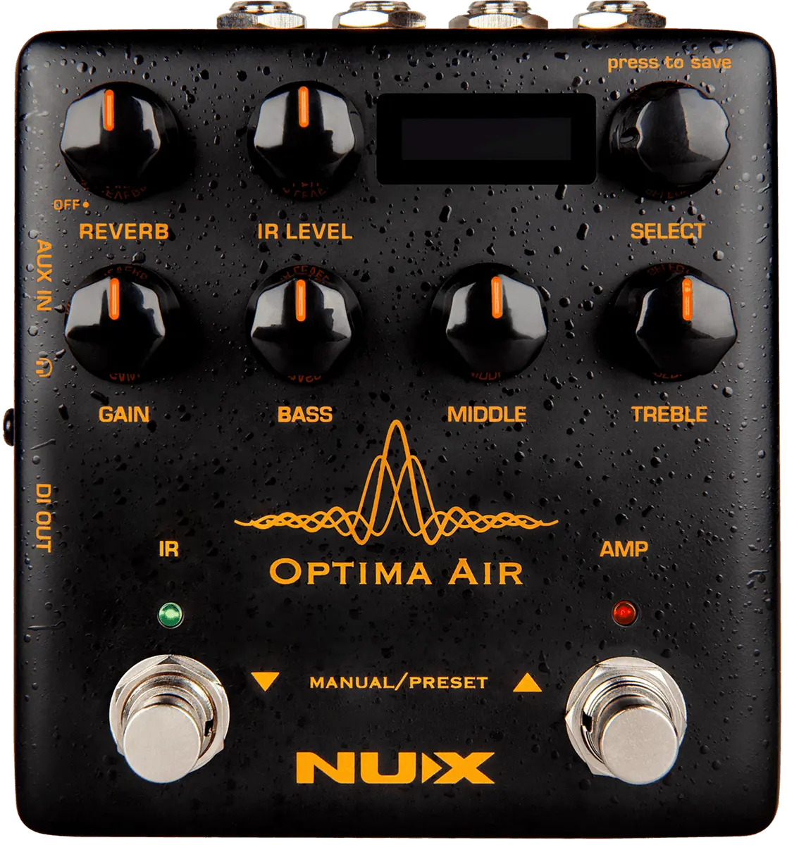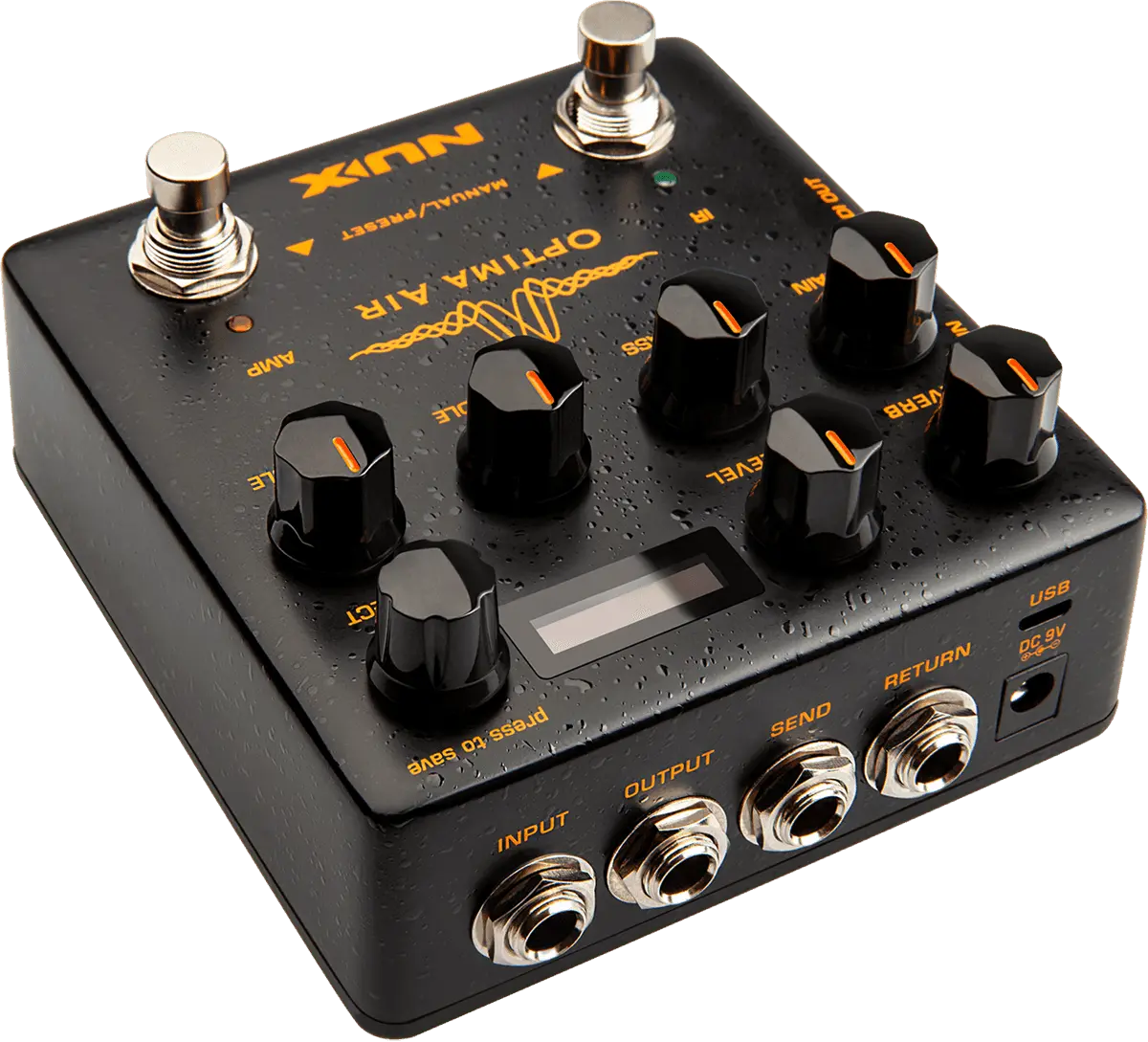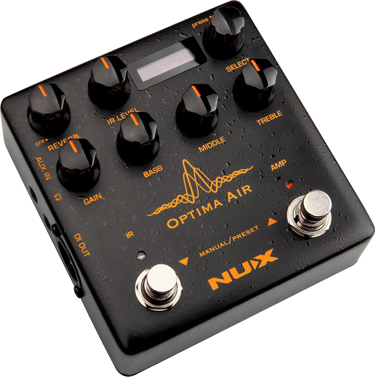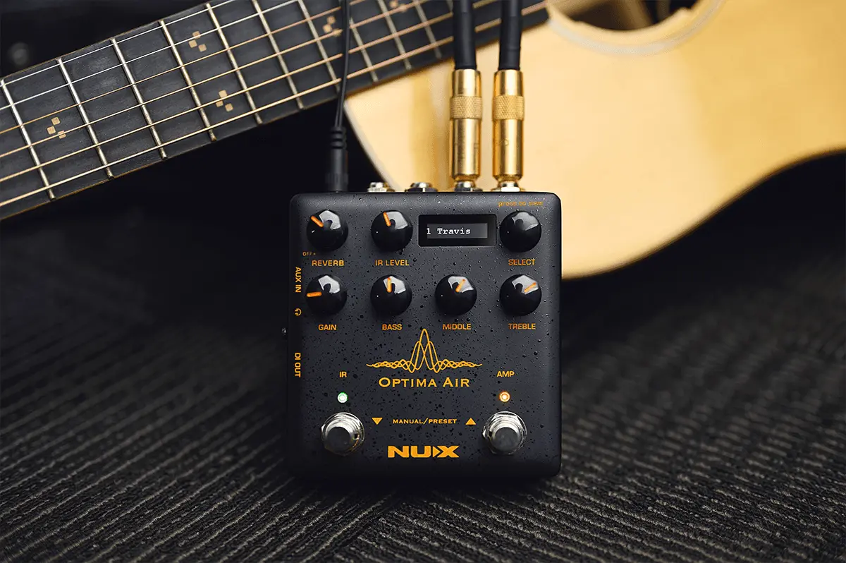 NUX Optima Air is a dual-switch acoustic guitar simulator with a preamp for acoustic and electric guitar players. It simulates the acoustic guitar profiles with the best-optimized sound depending on your guitar and pickup type.