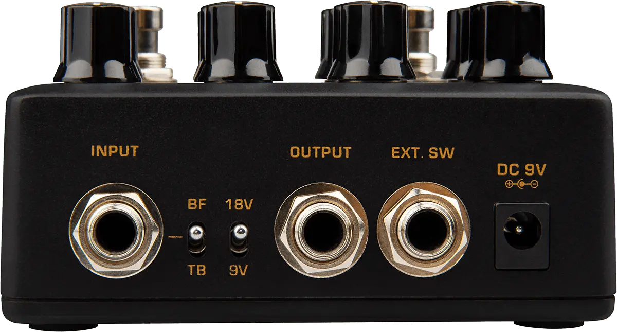 - Switch : On/Off, 9V/18V, Active channel selector (A/B), True/buffered bypass