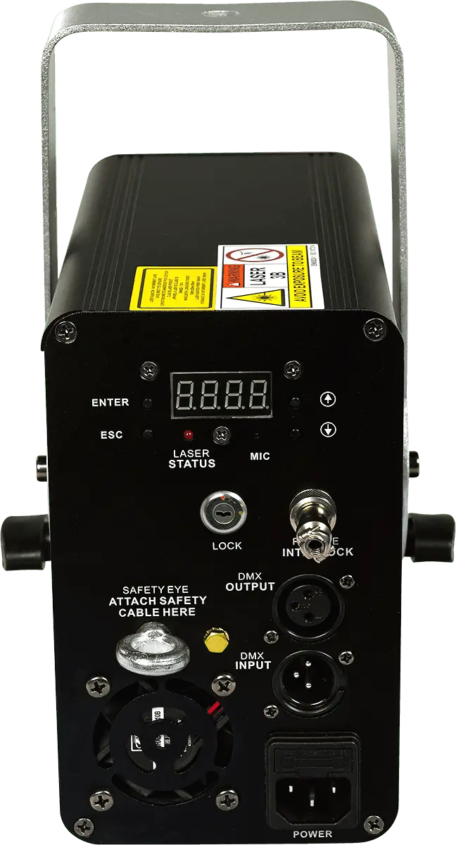 The Spectrum 400 RGB proudly features a total power of 400mW distributed over 3 motorised lasers ensuring surprisingly effective effects for this category. Ideal for DJs or mobile discos, the Spectrum 400 RGB, thanks to its 3 laser light sources (1 red, 1 green and 1 blue), allows multiple effects to animate the dance floor during weddings, private parties… Easy to use, offering no less than 128 internal programmes (tunnel effects, waves, geometric patterns, graphics, etc.) for automatic or music-controlled operation, the Spectrum 400 RGB is fully DMX controllable on 11 channels for precise control of the laser effects and their rotation speed, and for remote supervision of the many options available to create a multitude of stunning effects.