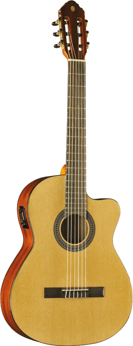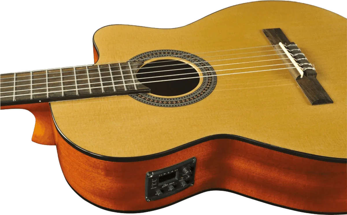 The VIBRA series is designed for classical guitar students. The 150 CW Eq model derives from the VIBRA 100; a Fishman preamp was installed in conjunction with the Cutaway to make this instrument even more versatile. It has been specifically designed for students who need to combine a performing studio instrument, an excellent guitar for live performance and a great quality / price ratio.