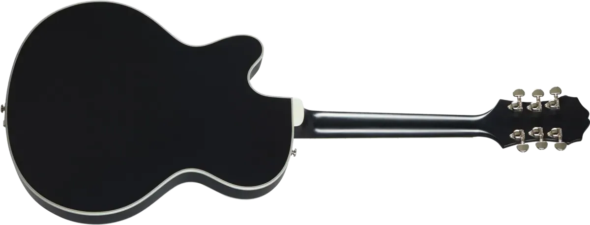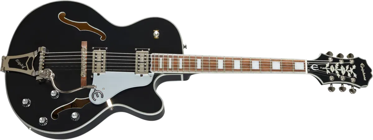 The Epiphone Emperor Swingster™ is a way-cool guitar that excels in a wide range of genres, including jazz, blues, rockabilly, country and rock. This hollowbody has a 5-ply layered maple body, mahogany neck with a comfortable and fast-playing SlimTaper™ profile, Indian laurel fretboard with block inlays, mother of pearl Epiphone and Tree of Life inlays on the large Clipped Dove Wing headstock, Grover® Rotomatic® tuning machines, and two Epiphone SwingBucker™ pickups, each with a dedicated volume and tone control. Push/pull switches are built into each volume control to provide series/parallel switching for the pickups, and along with the 3-way toggle pickup selector switch, give you a broad selection of tonal options. The LockTone™ Tune-O-Matic™ bridge is mounted on a pinned wooden base so it won't move out of place when you use the licensed Bigsby® vibrato with wire handle. Available in Forest Green Metallic with gold hardware, or Black Aged Gloss and Delta Blue Metallic finishes with nickel hardware.