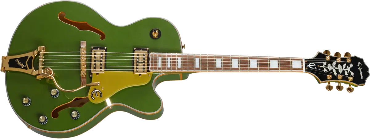 The Epiphone Emperor Swingster™ is a way-cool guitar that excels in a wide range of genres, including jazz, blues, rockabilly, country and rock. This hollowbody has a 5-ply layered maple body, mahogany neck with a comfortable and fast-playing SlimTaper™ profile, Indian laurel fretboard with block inlays, mother of pearl Epiphone and Tree of Life inlays on the large Clipped Dove Wing headstock, Grover® Rotomatic® tuning machines, and two Epiphone SwingBucker™ pickups, each with a dedicated volume and tone control. Push/pull switches are built into each volume control to provide series/parallel switching for the pickups, and along with the 3-way toggle pickup selector switch, give you a broad selection of tonal options. The LockTone™ Tune-O-Matic™ bridge is mounted on a pinned wooden base so it won't move out of place when you use the licensed Bigsby® vibrato with wire handle. Available in Forest Green Metallic with gold hardware, or Black Aged Gloss and Delta Blue Metallic finishes with nickel hardware.