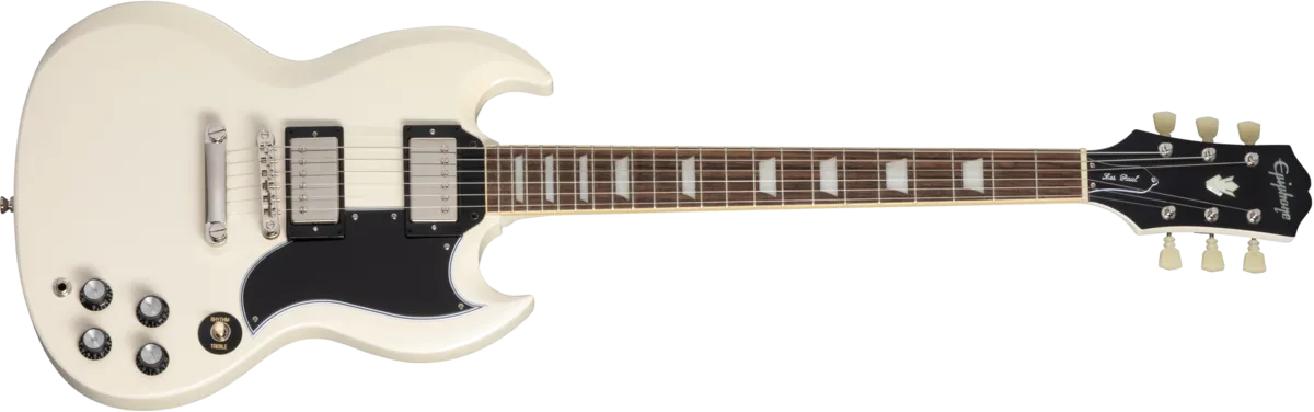 Made in partnership with the Gibson Custom Shop, this Inspired by Gibson™ model is Epiphone’s impressive recreation of one of the most important and popular guitar designs of all time. The Epiphone 1961 Les Paul™ SG™ Standard pays tribute to the legendary original - the very first SG. In 1961, the original shape of the Les Paul model went on hiatus, replaced by an all-new design that is known today as the SG or “solid guitar.” Featuring a two-piece solid mahogany, double-cutaway body with Custom Shop Historic bevels, it also has the one-piece mahogany, fast-playing SlimTaper™ C-shaped neck profile of those legendary early Les Paul SG models. It also has a historically inspired long pickguard and comes equipped with a pair of Gibson™ BurstBucker™ humbucking pickups wired to CTS® potentiometers and Mallory™ capacitors, a Graph Tech® nut, and Switchcraft® output jack and toggle switch. The Epiphone Deluxe tuners feature a historically inspired double ring design. It is available in Aged Sixties Cherry and Aged Classic White. Of course, all of the legendary SG styling and cosmetic touches are here too, and a vintage-style hardshell case is also included.