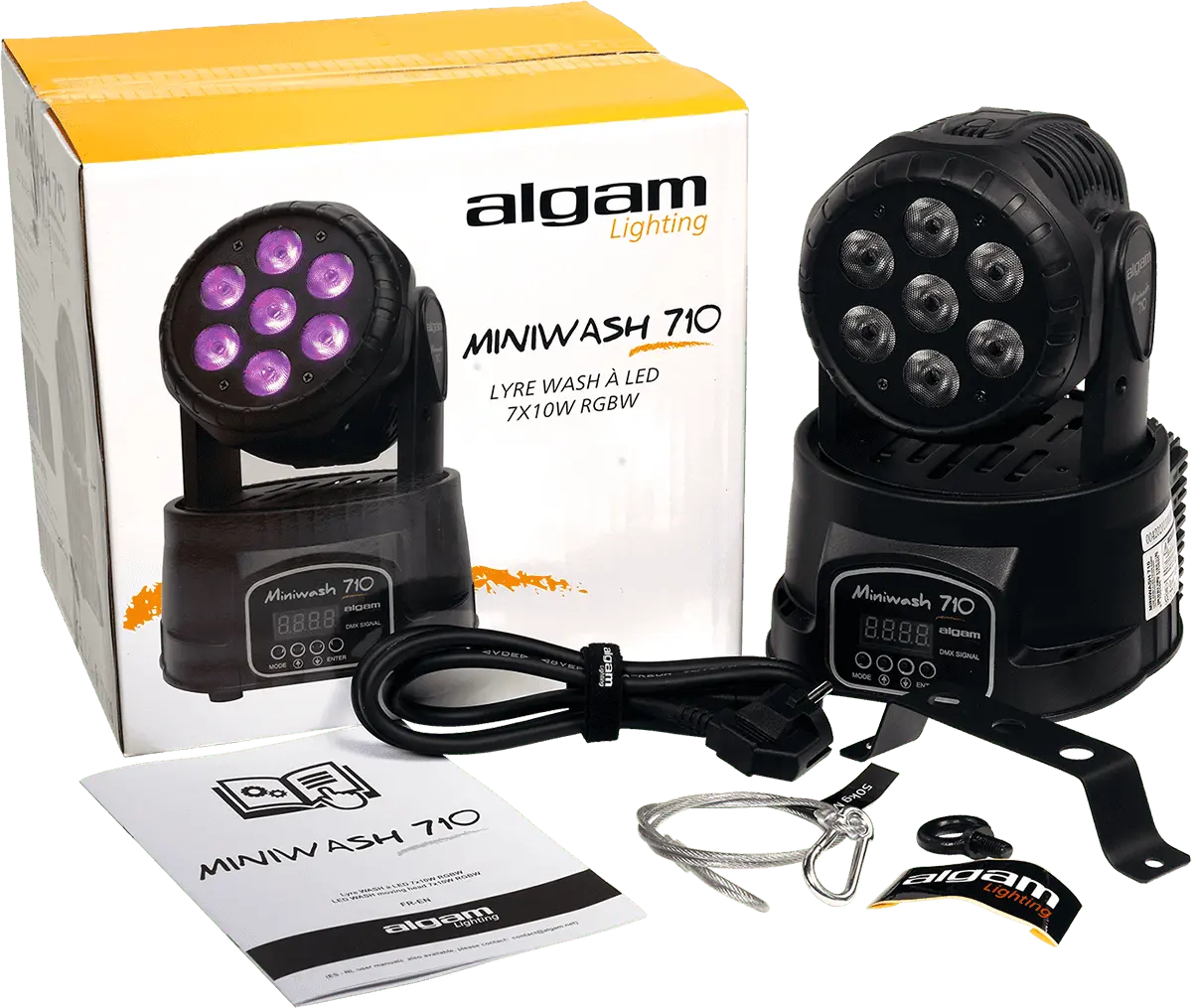 Powerful but compact, the wash moving-head MINIWASH 710 from Algam Lighting has 7 RGBW LEDs for generous and warm light beams. Packed with features for amazingly energetic effects, operating in automatic, music-controlled or DMX mode, it has quiet and stealthy motors that offer pan up to 540° and 270° tilt, ensuring a variety of head-turning moves.