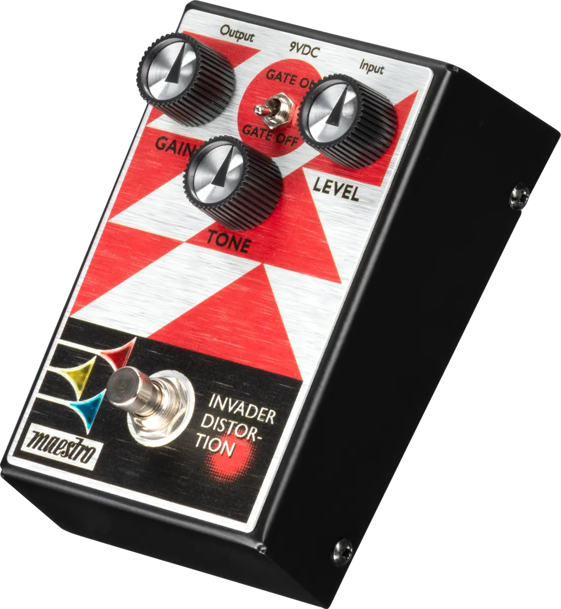 The Maestro Invader Distortion is a high-gain, all-analog modern distortion pedal with a heavy, aggressive, dominant sonic character and loads of rich harmonics. With the Maestro Invader Distortion, users can generate a wide range of distorted sounds. The 3-knob control layout gives users intuitive control over Gain (distortion amount), Tone, and output Level, with more than enough volume on tap to easily exceed unity gain when you want to. Users can also engage a built-in noise gate with the top panel toggle switch. An internal trim pot mounted on the circuit board inside the pedal allows the user to adjust the level of the noise gate's Threshold. The true bypass footswitch triggers the LED lights in the bugles in the Maestro logo when it’s on, so you’ll always know when the effect is active.