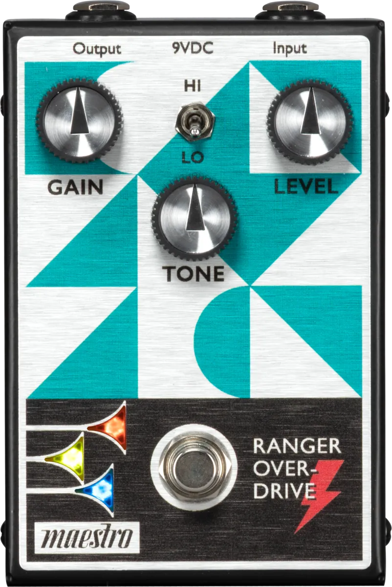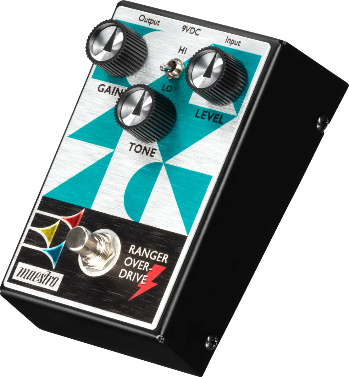 Inspired by the overdriven tones of some of the world’s most cherished vintage tube amps, the Ranger is a modern, all-analog overdrive pedal featuring a Mode toggle switch that provides two different tonalities; a warm, expressive, amp-like overdrive and a second tonality that’s slightly cleaner and exceptionally touch-sensitive; it blends in some of the clean signal and is a great choice for use as an “always on” effect that can be controlled with your pick attack and your guitar’s volume control. The Ranger’s classic 3-knob layout provides intuitive adjustment of Gain (amount of overdrive), Tone, and output Level, with plenty of volume on tap to go well beyond unity gain. You can easily use the Ranger Overdrive as a boost to hit the input of your tube amp harder for even more grit and dirt. The true bypass footswitch triggers the LED lights in the bugles in the Maestro logo when it’s on, so you’ll always know when the effect is active.