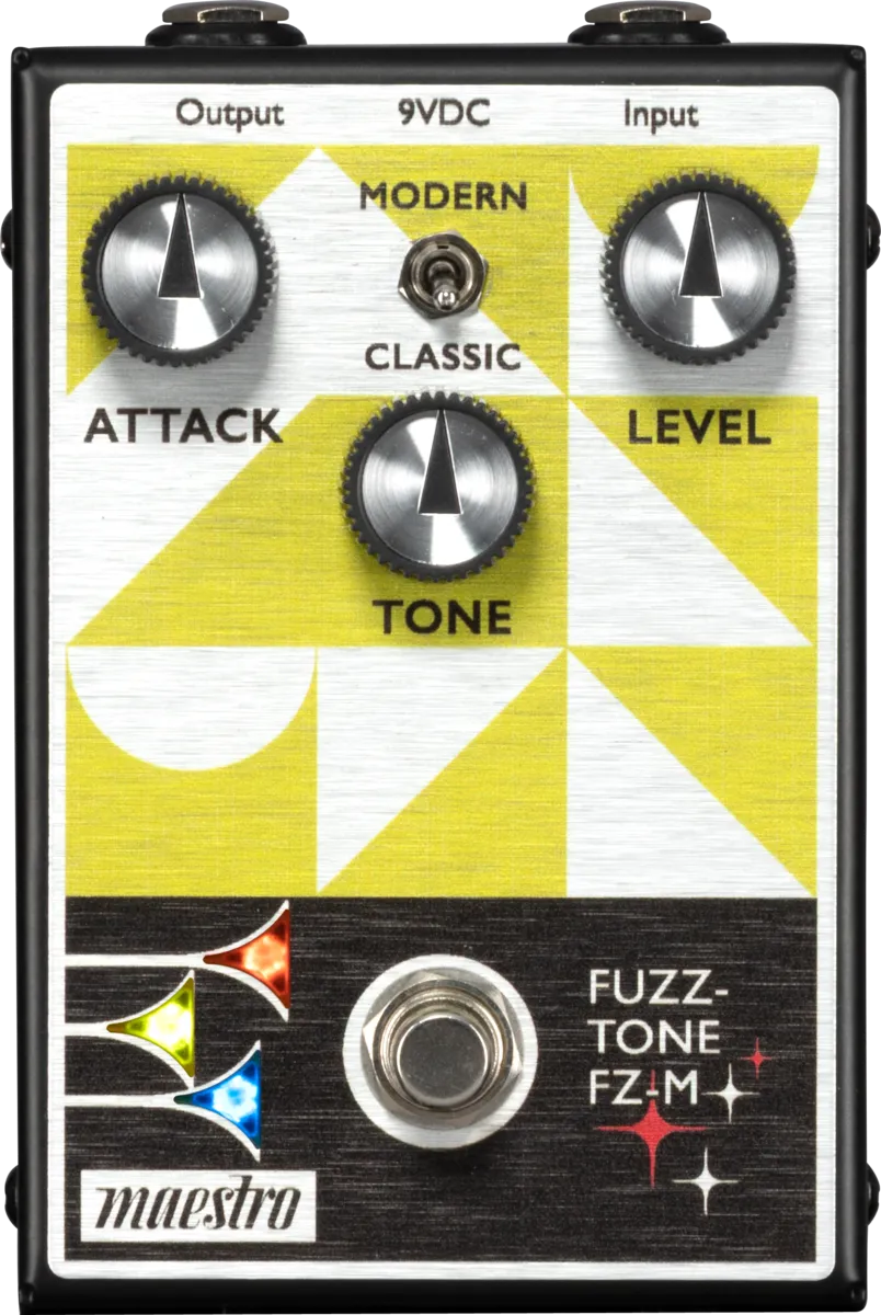 Maestro created the world’s first fuzz pedal – the Maestro Fuzz-Tone FZ-1. Introduced in 1962, the Fuzz-Tone became the sound of rock and roll and a must-have accessory for guitarists everywhere after the success of 1965’s (I Can’t Get No) Satisfaction by the Rolling Stones, which prominently featured its cutting edge sound. Now Maestro is bringing the fun and sonic fury of those early Fuzz-Tones back with the new Maestro Fuzz-Tone FZ-M. This all-analog pedal boasts a Mode toggle switch that provides two pedals in one functionality for increased sonic versatility with both an FZ-1 inspired fuzz sound and a thicker, more modern fuzz tone. Its 3-knob control layout gives you intuitive control. The Attack knob controls the amount of fuzz. The Tone control lets you adjust the timbre from bright and raspy to warm and wooly and anywhere in between. Use the Level control to set the output volume; it can go way beyond unity gain when desired. The true bypass footswitch triggers the LED lights in the bugles in the Maestro logo when it’s on, so you’ll always know when the effect is active.