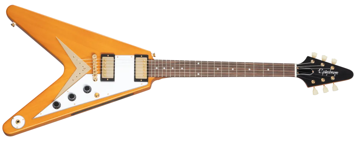 Made in partnership with the Gibson™ Custom Shop, the 1958 Korina Flying V™ is Epiphone’s impressive recreation of one of the most famous and valuable vintage guitars ever made. It brings authentic 1958 Flying V details to guitarists everywhere at a breakthrough price. Like the ultra-rare original Gibson models from 1958, it features a solid Korina body and a Korina neck with a long neck tenon and a 1958 Flying V neck profile. It is also equipped with an Indian laurel fretboard and gold hardware. The electronics are also top-notch, with Gibson Burstbucker™ 2 and Burstbucker 3 pickups wired to individual volume controls and a master tone control with CTS® pots and a Mallory™ capacitor, along with a Switchcraft® 3-way pickup selector switch and 1/4” output jack. An Epiphone x Gibson Custom logo on the back of the headstock is also proudly displayed, and a hardshell case is also included.
