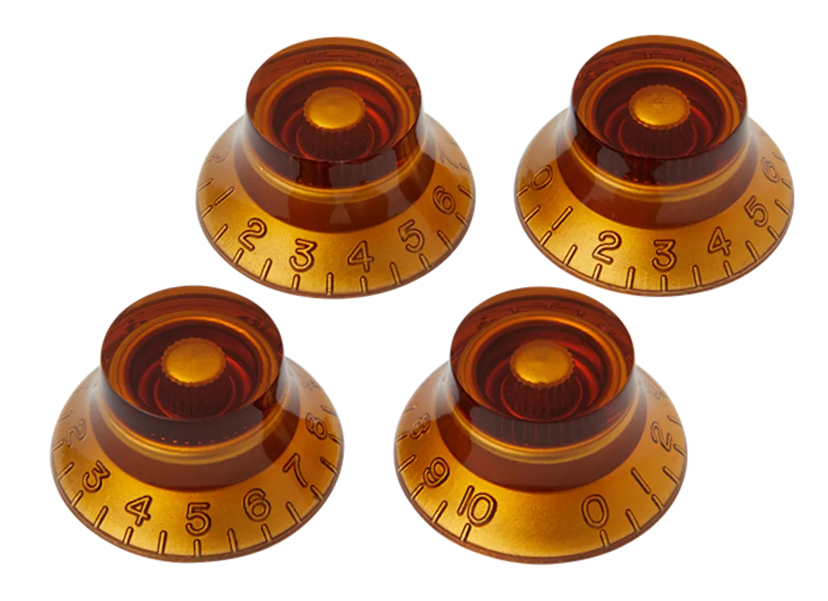 These genuine Gibson OEM top hat style knobs are the same knobs found on many vintage and current Gibson guitars, and can be used for vintage restoration or the replacement of lost knobs. Gibson top hat knobs come packaged in sets of four, and are available in either black, vintage gold, or vintage amber, all with white numbers.