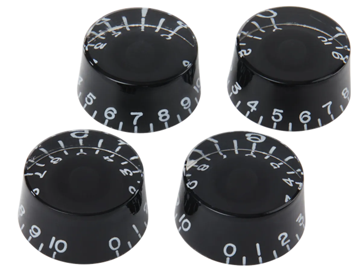 Sold in packs of 4. These genuine Gibson OEM speed knobs are the same knobs found on many vintage and current Gibson guitars, and can be used for vintage restoration or the replacement of lost knobs. Gibson speed knobs come packaged in sets of four, and are available in either black or gold with white numbers.