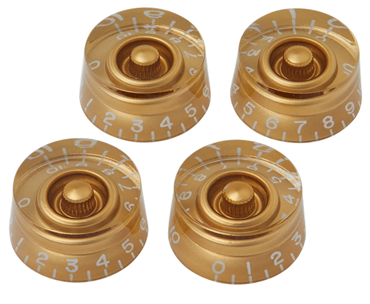 Sold in packs of 4. These genuine Gibson OEM speed knobs are the same knobs found on many vintage and current Gibson guitars, and can be used for vintage restoration or the replacement of lost knobs. Gibson speed knobs come packaged in sets of four, and are available in either black or gold with white numbers.