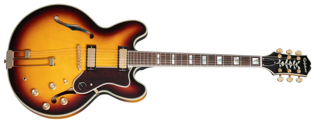 Epiphone ProBucker™ mini humbuckers™ deliver a wide dynamic tonal range that finds : voice in nearly any genre. Gold hardware, including a vintage-styled Frequensator ™ Split Trapeze tailpiece, add to the simple, timeless aesthetic of this Epiphone legend.