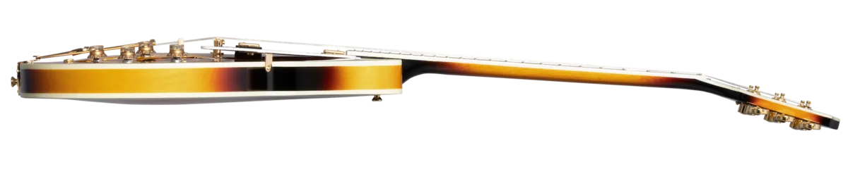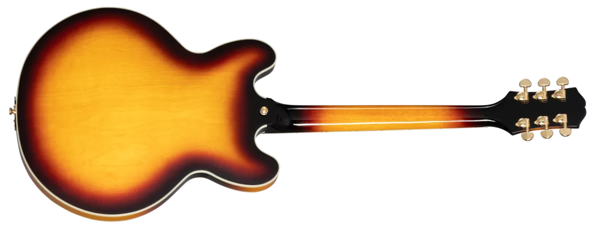 One of Epiphone's most storied guitars, the Sheraton returns in both Vintage Sunburst and Natural finishes. This elegant instrument features a semi-hollow body crafted rom layered maple with a maple centerblock for feedback resistance. The 22-fret, mahogany neck has a bound Indian laurel fretboard with block mother of pearl with abalone triangle inlays. The bound headstock has historic Epiphone logo and tree of life in mother of pearl.