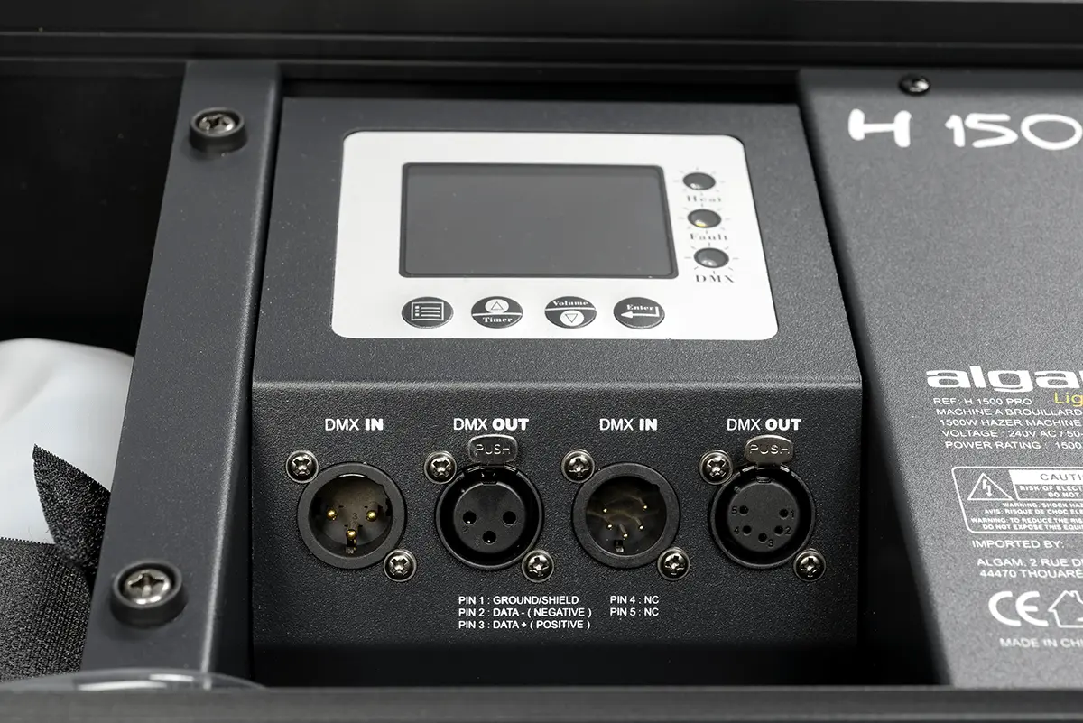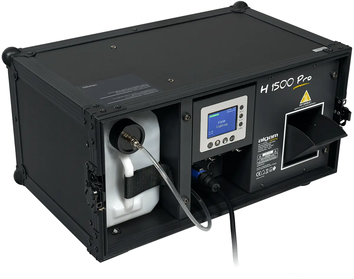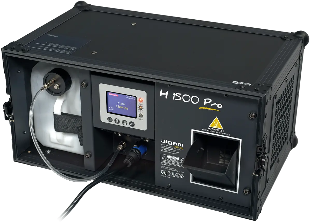 The H1500-PRO haze machine is housed in a sturdy flight case for easy transport and will quickly become indispensable for enhancing your light shows. Discreet, with a maximum flow rate above 1000 m3 per minute, low fluid consumption of approximately 12ml per minute and a heat-up time of about 50 seconds, the H1500-PRO will prove to be highly efficient in many possible applications. The H1500-PRO is a must for private parties and festive event venues. It offers different operating modes and numerous settings (trigger intervals and durations, auto timer, smoke volume output, fan speed), all DMX controllable or from the control screen with LCD display.Algam Lighting recommends using haze fluid.