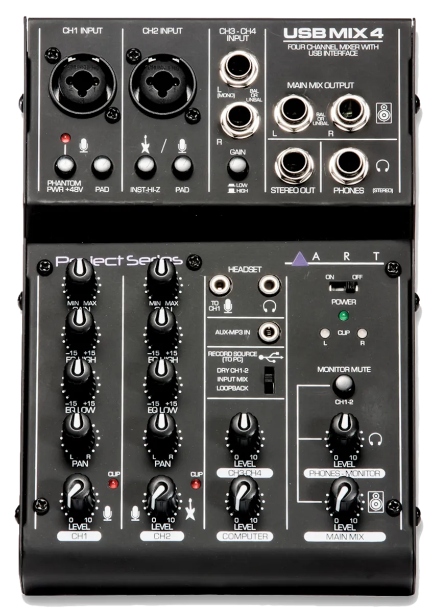 The ART USBMix4 is a great starting point for building a personal home studio. Perfect for podcasters, songwriters or at home movie makers looking for a simple solution for recording voiceovers, location recording or adding music to your projects using any Mac or PC.