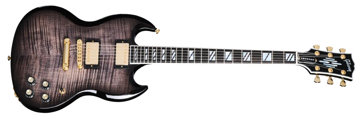 Gibson is excited to announce the return of the SG™ Supreme. With a refreshed feature set, it is bound to overshadow everything else in sight and be one of the most exciting new releases of the year. It features a beautiful AAA-figured maple top on a mahogany body. The mahogany neck has an ebony fretboard with a compound radius, 24 medium jumbo frets, and Super Split Block mother-of-pearl inlays. The headstock is adorned with a striking new mother-of-pearl "Chandelier Inlay" inspired