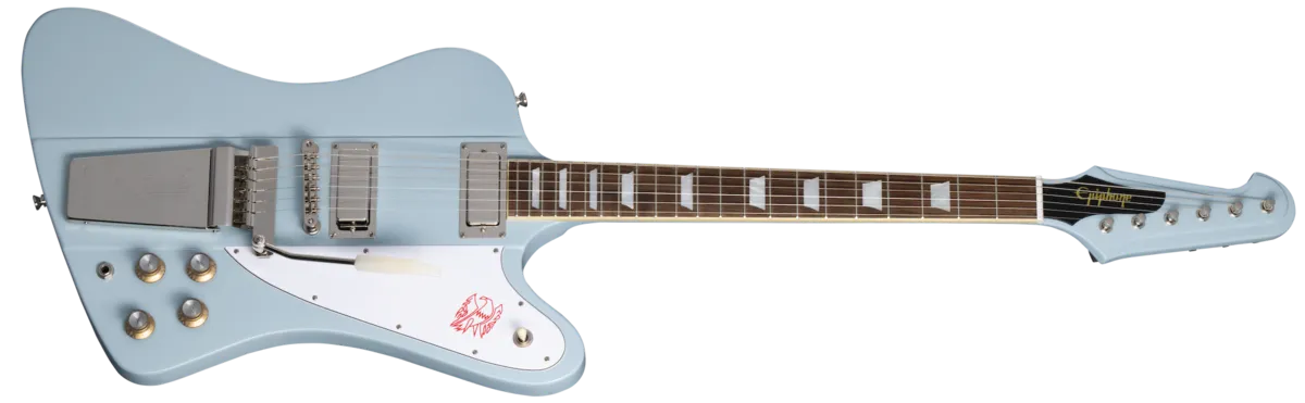 Epiphone and the Gibson Custom Shop have teamed up again to create the Inspired by Gibson Custom 1963 Firebird V - an authentic replica of the guitar designed by legendary automotive designer Ray Dietrich. When it was launched in 1963, the Firebird™ was Gibson's first neck-through-body model, and it went on to be used by players in a wide range of genres, including blues legend Johnny Winter, Keith Richards and Brian Jones of The Rolling Stones, Eric Clapton, and Phil Manzanera of Roxy Music, to name a few. The Epiphone Inspired by Gibson Custom 1963 Firebird V delivers vintage Firebird specifications at an accessible price, including a 9-ply neck-through-body made of mahogany and walnut with mahogany body wings to either side. Kluson® planetary geared "banjo" tuners anchor the strings at the headstock, while an Epiphone ABR bridge and newly redesigned Maestro ™ Vibrola ™ with an engraved Epiphone logo hold things down at the other end. The electronics are also premium and include Gibson USA Firebird mini humbucker™ pickups with Alnico 5 magnets, CTS® potentiometers, Mallory ™ capacitors, and a Switchcraft® 3-way pickup selector toggle switch and 1/4" output jack, giving this remarkable recreation not only the look but also the sound of a classic Firebird V. An Epiphone Inspired by Gibson Custom hardshell case is also included.
