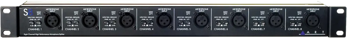 The ART S8 can be used to split eight balanced low impedance microphone signals into sixteen balanced low impedance microphone signals (eight pairs).