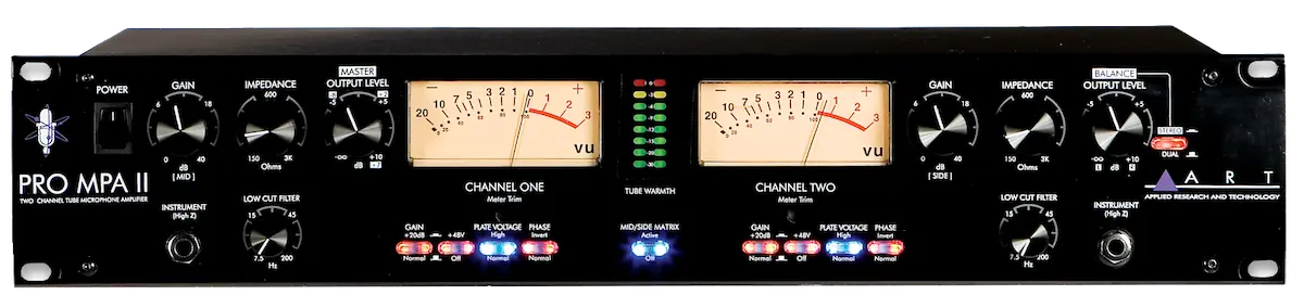 The ProMPA II can operate at either a low or high plate voltage on the two integrated hand-selected 12AX7 tubes for wider variation of preamp tone and performance. Large back-lit analog VU output meters display output levels while multi-colored LED arrays show tube gain.