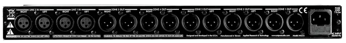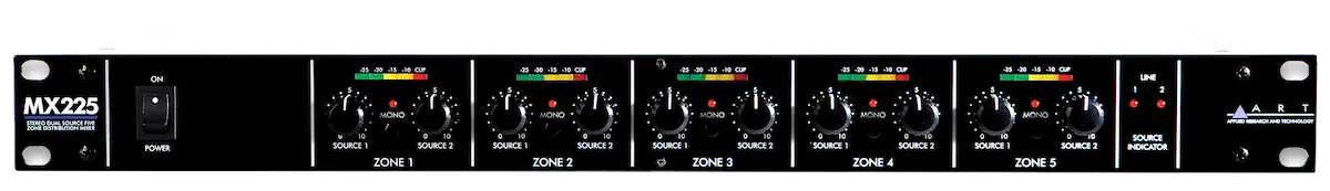 The MX225 is designed for remote volume control of multiple amplifiers or powered speakers in a distributed audio system. Two stereo sources are available to each of five output zones. Each source input pair handles separate left and right balanced line level signals. Each output zone features independent level control from inputs 1 and 2, stereo/mono selector with mono indicator, LED level metering, and left and right balanced line level zone outputs. All audio connections are balanced XLR. The built in power supply and single high 19″ rack mount format allows for easy installation and reliable operation.