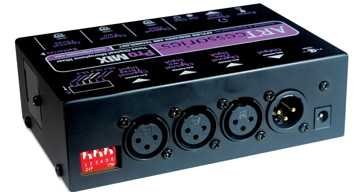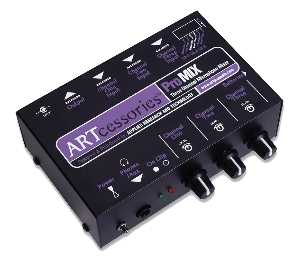 Solution:Insert a ProMIX between the mics and the mixer. Each mic channel on the ProMIX has both phantom power and low-frequency cut selectable via DIP switches plus a level control. The balanced XLR line output can be connected to a mic input on the mixer and headphones or a powered monitor can be connected to the Phone/Aux output. And if AC power is not available, the ProMIX runs on batteries as well.
