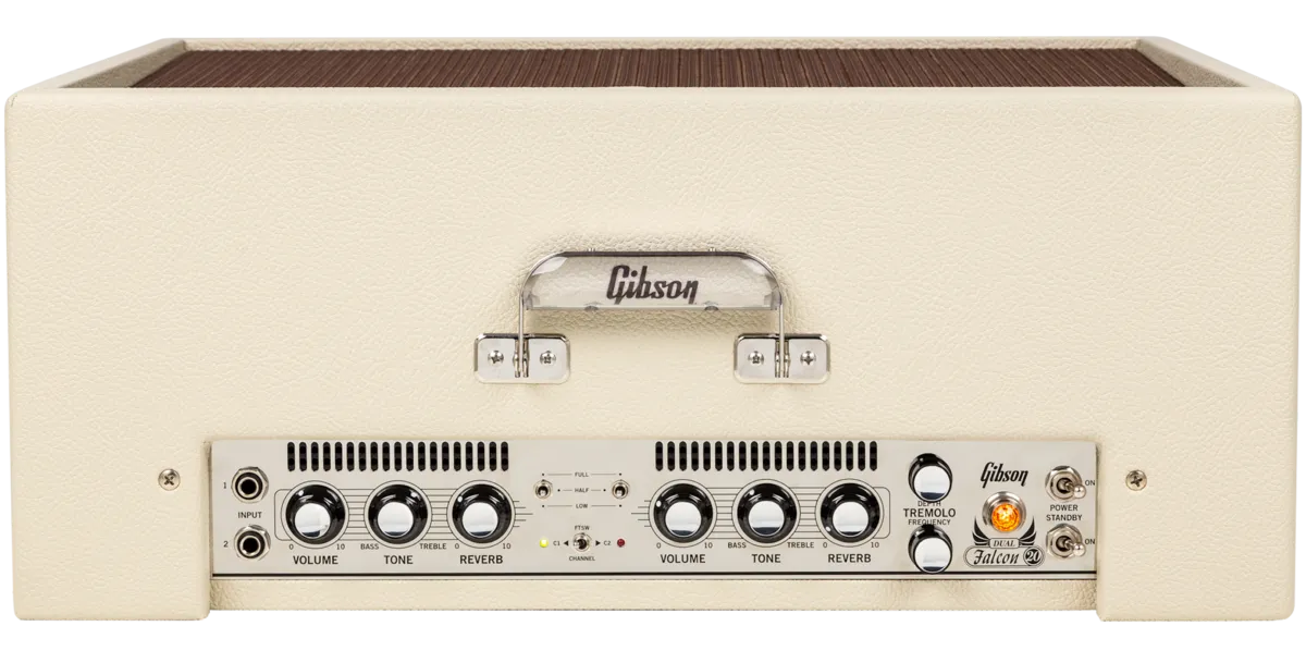 Gibson is proud to introduce the new Dual Falcon 2x10 Combo amplifier. It pays homage to Gibson's legendary past as one of the world's first manufacturers of electric guitar amplifiers. The Dual Falcon resurrects the Gibson amp icon and delivers vintage tone, reimagined in an upgraded 2 Channel rendering with valuable new features and all the original magic intact, and then some. Perfect tonal enhancements update the sound and feel, with a wider, more usable range on the sparse controls, while lush traditional spring Reverb adds dimension and broadens stylistic horizons. The original smooth-sounding Tremolo adds further vibe while selectable output power options expand the versatility with options of Full, Half, or Low power modes per channel. These updates allow the new Dual Falcon to soar even higher above the most prized vintage Gibson examples.