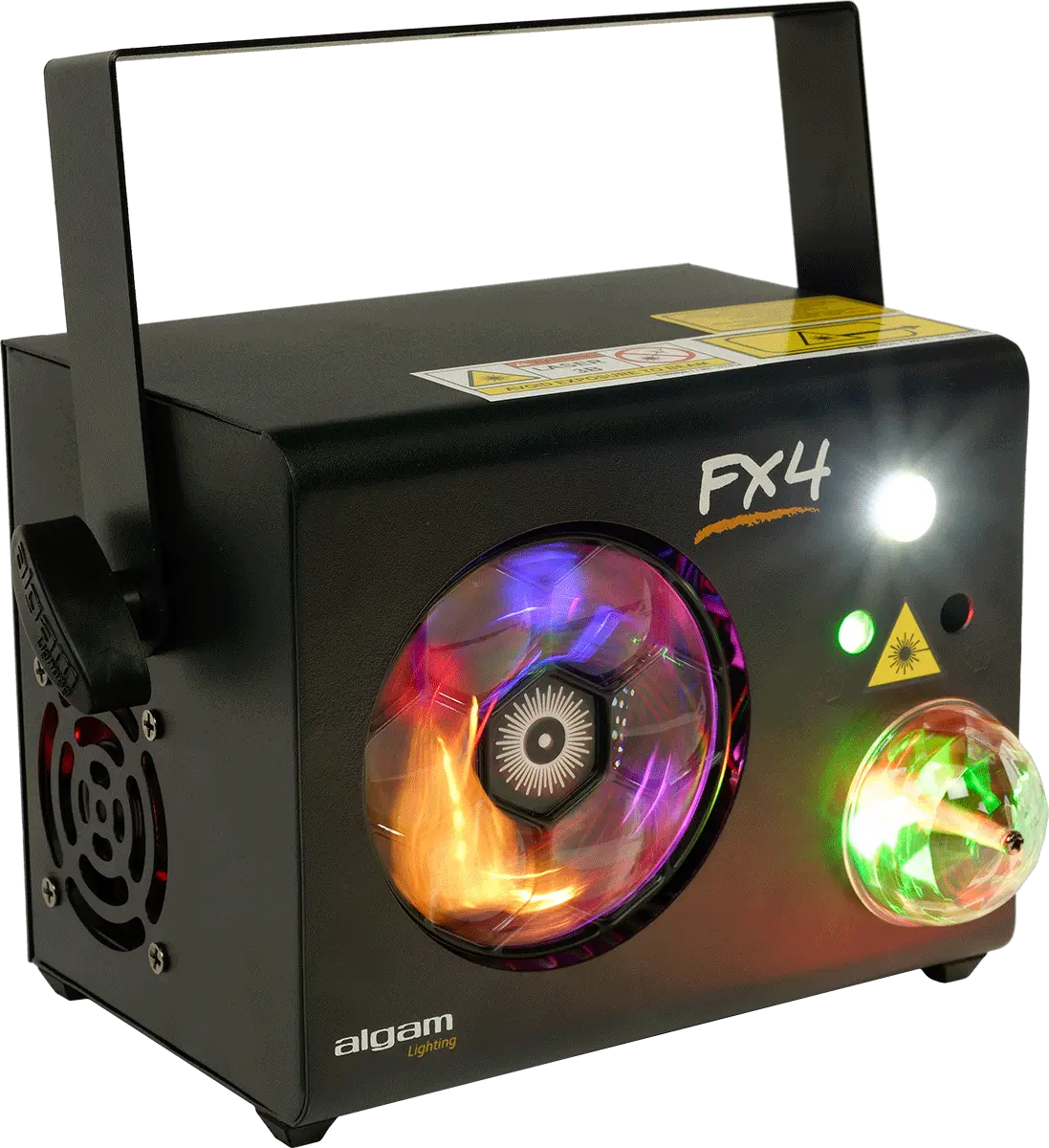 The FX-4 by Algam Lighting is a versatile 4-in-1 light system designed to instantly switch the mood to "Party Mode" in a heartbeat to any event. Despite its compact size and affordability, this all-in-one lighting system packs a punch. features a 6x3W RGB LED gobo wheel that projects various light patterns onto the dancefloor, as well as a 3x3W Magic Ball that diffuses sparkling light effects for a warm and festive ambiance. In addition, the FX-4 includes a multipoint red/green laser that projects multiple beams throughout the room and a stroboscope effect that offers a wide range of dynamic effects. The FX-4 is easy to use, thanks to its automatic mode and music detection mode, which eliminates the need for tedious programming. However, advanced users can take advantage of the 14 DMX channels available to fine-tune the control of this feature-rich combo.