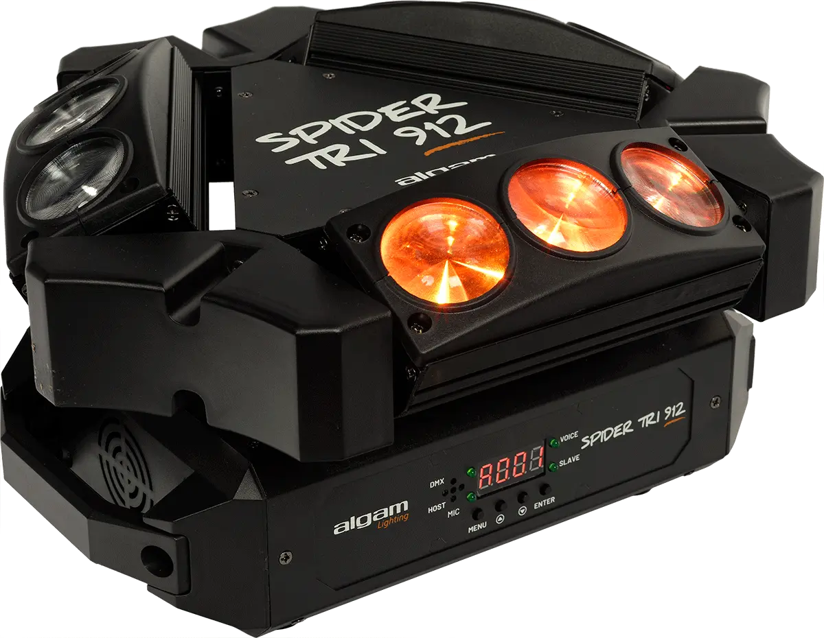 The SPIDER TRI 912 is the ideal dynamic LED lighting system suitable for discos, concerts, and private events. It is easy to install and can be set up in various ways, such as being placed on the floor or suspended upside down. The system consists of three motorized mini-bars that can be adjusted in tilt and each contains three independently adjustable 12W RGBW LEDs. The three mini-bars are cleverly arranged in a triangle shape and are mounted on a motorized axis, enabling quick 360° rotation and impressive beam sweeps, creating a vibrant atmosphere on the dance floor. The lighting system offers built-in automatic and music detection modes for users who prefer a quick setup without having to make tedious adjustments. Additionally, more advanced users can utilize the DMX mode to program their light show precisely.