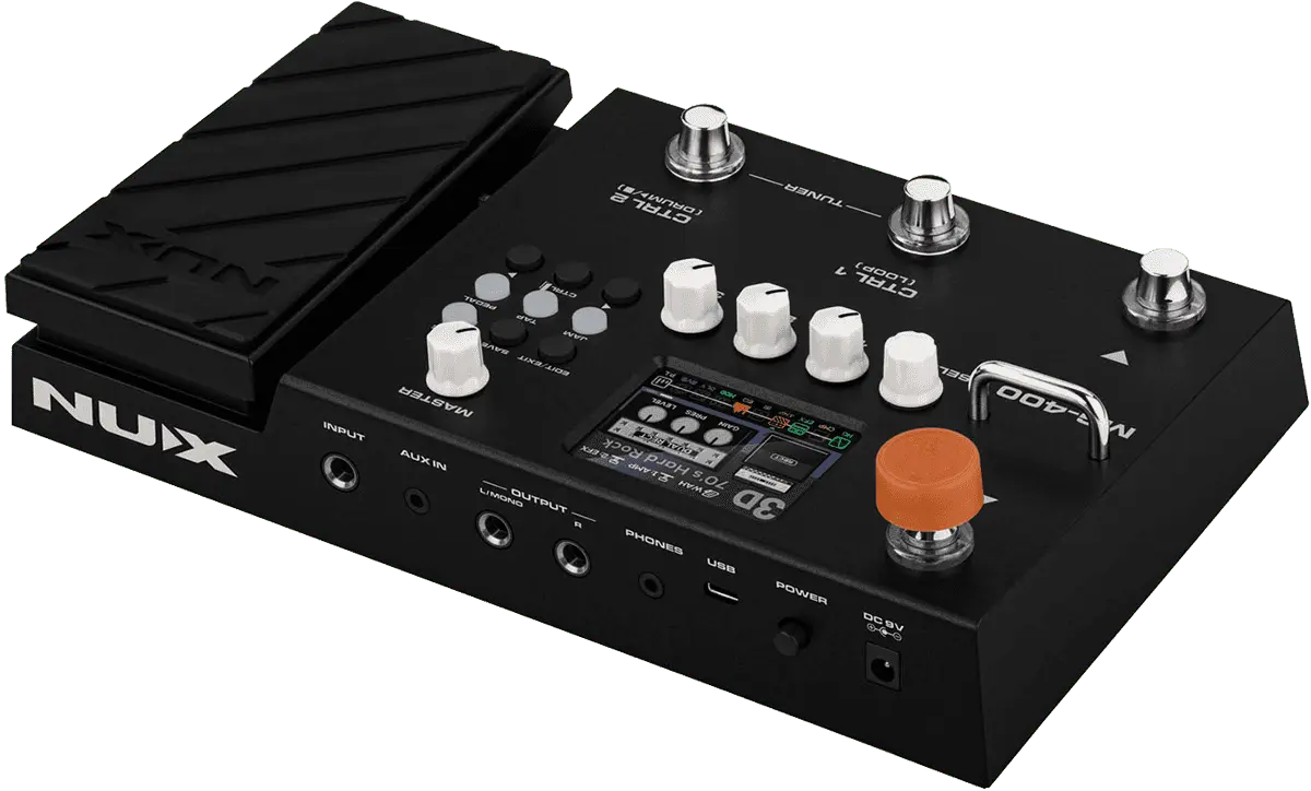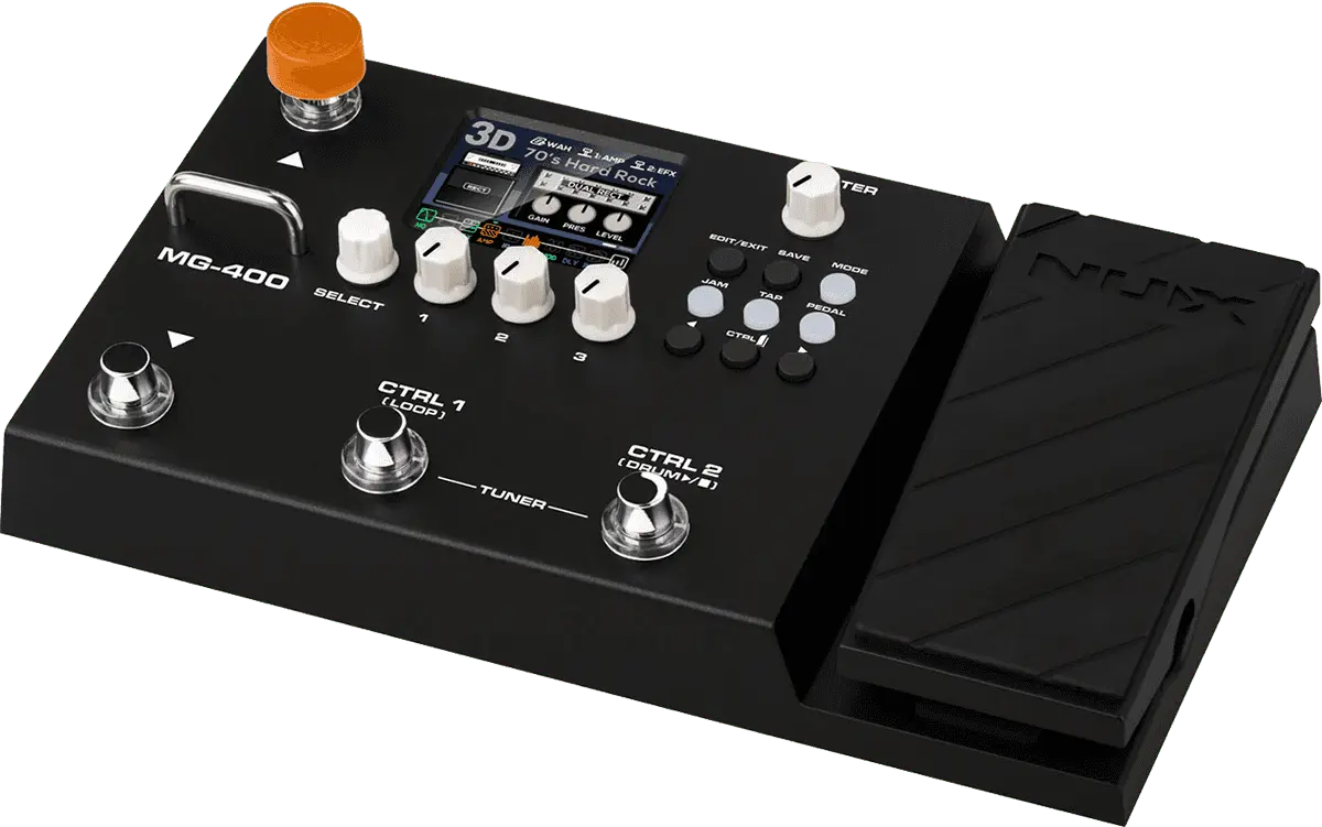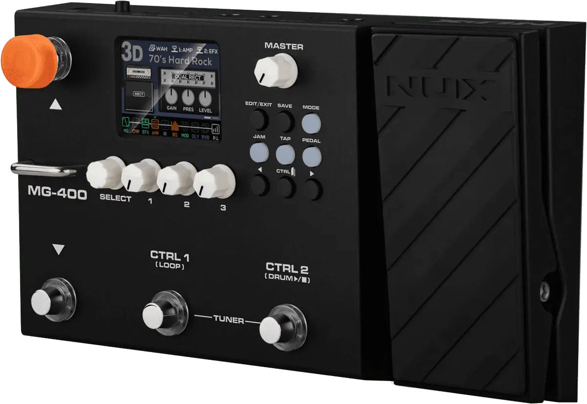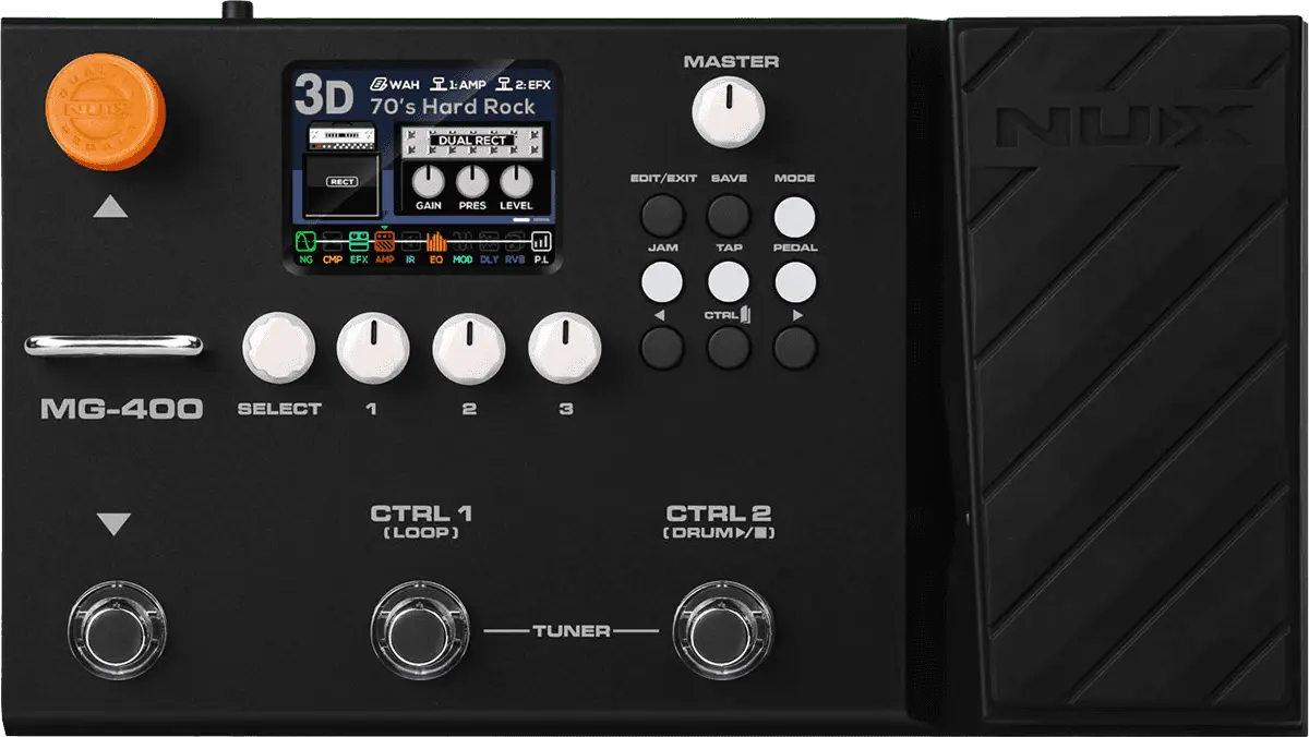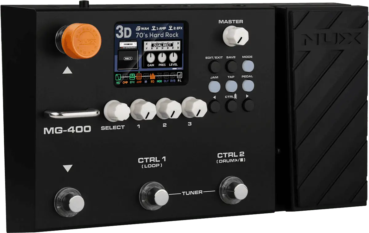 The NUX MG-400 is a value packed modeler akin to his little brother, the MG-300. MG-400 houses 2 powerful DSP chips for high-definition White-Box Amp Modeling algorithm (TS/AC-HD) and Core-Image post-effects. Since releasing the MG-300, people have been blown away by the sound and playability, not to mention the ease-of-use tone tweaking and intuitive interface. And now, the MG-400 builds upon the MG-300 feature set moveable signal blocks, 12 IR COLLECTION slots, flexible P.L block with MIN & MAX parameter setup, abundant SYSTEM MENU, and physical MASTER volume knob, MG-400 is now the best value modeler for the money.