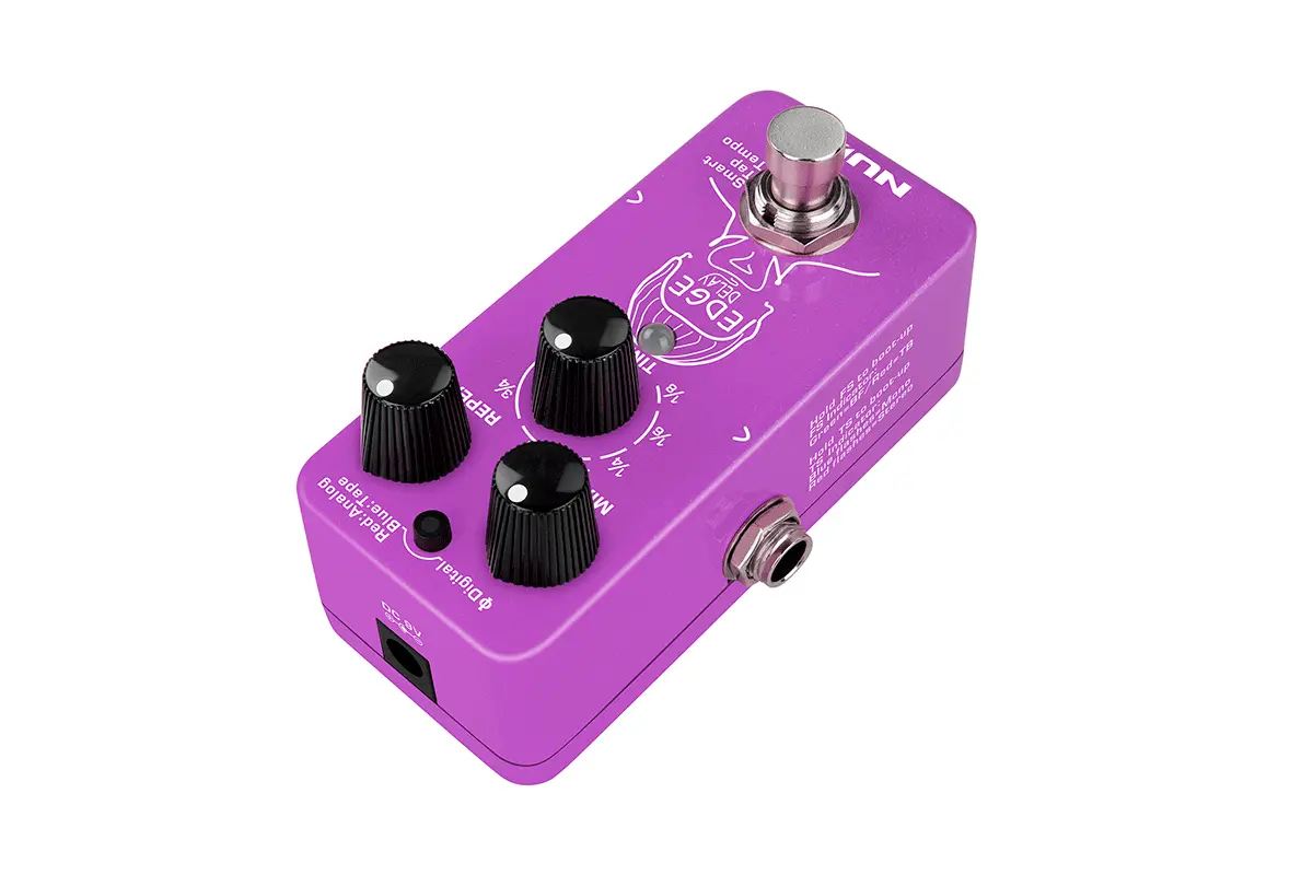 The Edge delay (NDD-3) is a mini delay pedal with 3 different delay types including @Phi Digital Delay, Analog Delay, and Tape Echo. You can switch delay types by pressing and holding the footswitch.