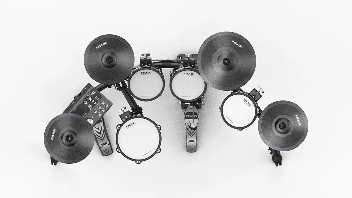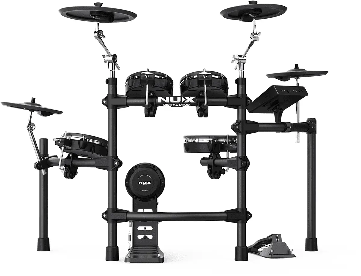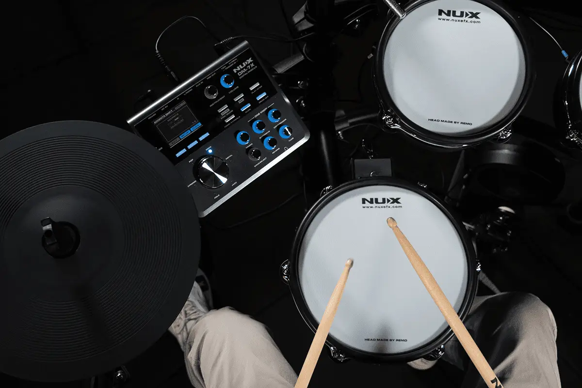 Professional Electric Drum Set with All Mesh Heads NUX collaborates with REMO, the world-renowned drumhead brand, and equips DM -7X with all excellent REMO mesh heads. Enhanced by the latest Dual-Triggering technology (head and rim), DM-7X's 10" NDP-10 snare and the 8" NDP-8 toms provide accurate triggering and large strike area, together with authentic acoustic feel. Meanwhile, with the advanced velocity-sensitive drum pads and cymbals, you can set parameters for your drum triggers to ensure the most accurate and natural response. DM-7X also features 30 precisely-sampled studio kits and a customizable sound library, which delivers the most realistic and expressive drum sounds. In addition, practice mode offers recording and 5 types of coach functions, and various effects are available to further expand the playability.