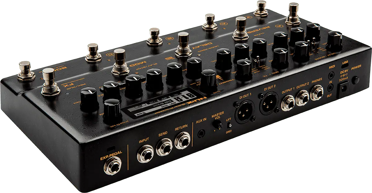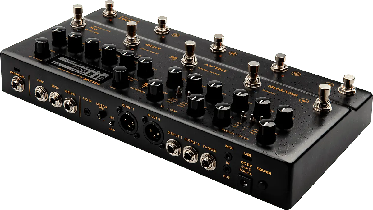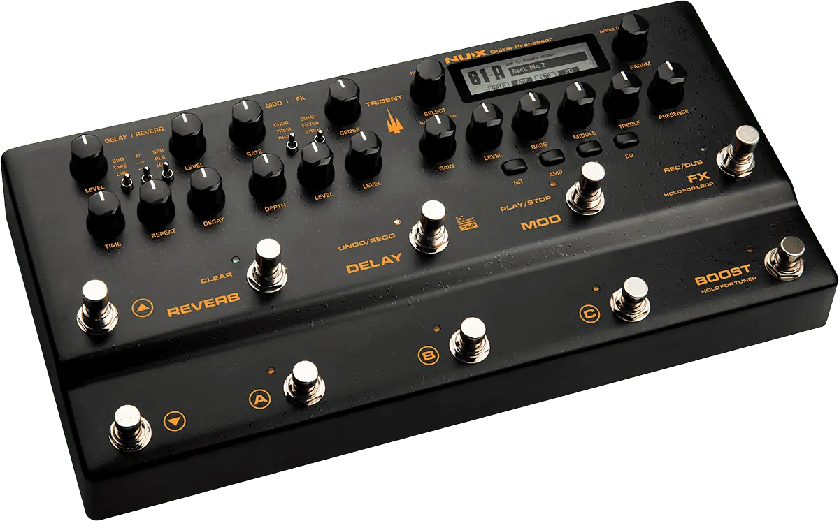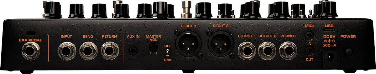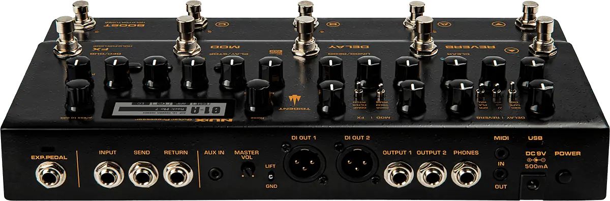 Perfect for live applications, the TRIDENT offers plenty of 1/0 options. The SEND/RETURN effect loop for external effects, 2 balanced XLR outputs to the PA system, PHONES output for monitoring, EXP. PEDAL input for adding an expression pedal, MASTER VOL pot, and MIDI IN / OUT.