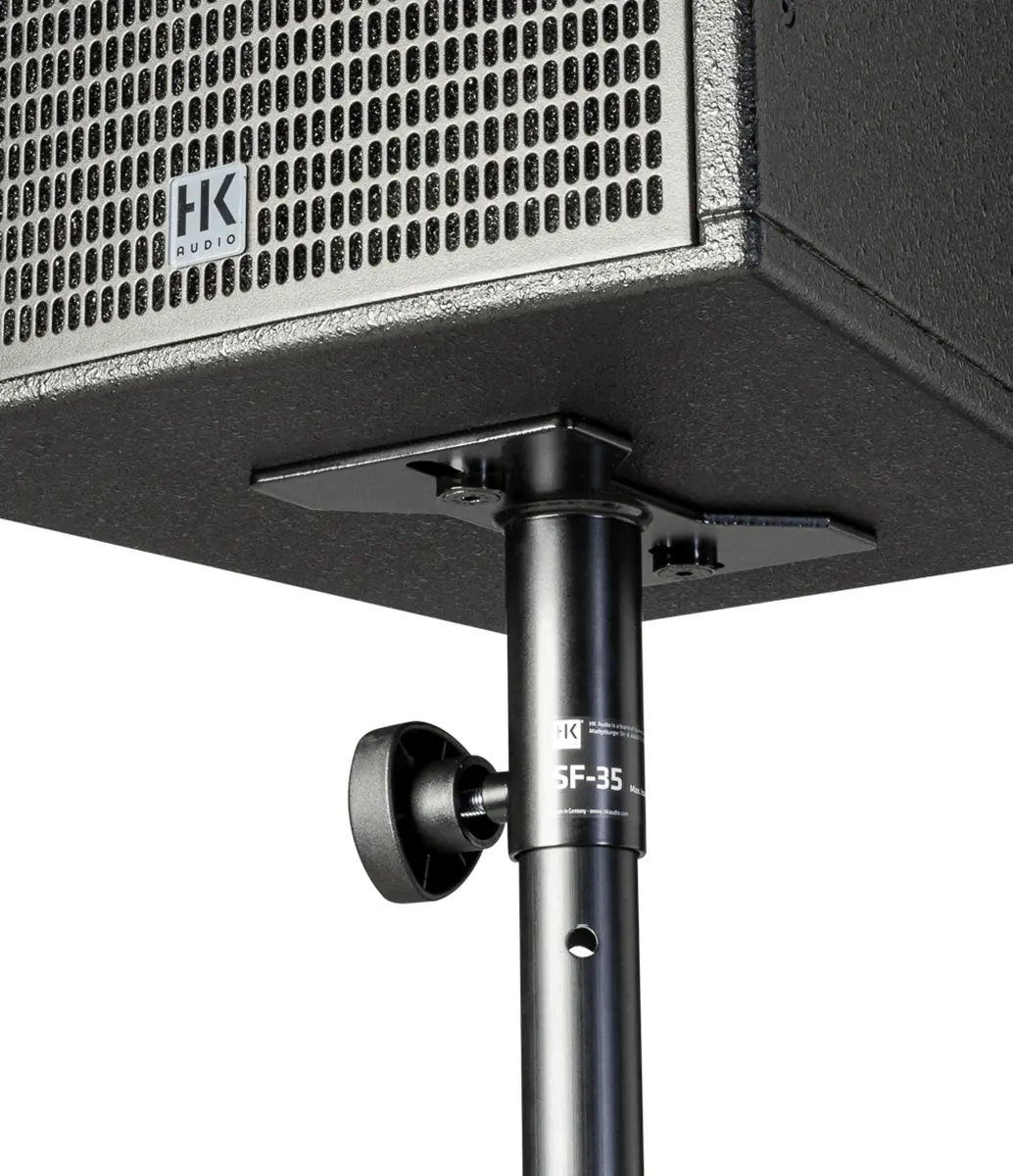 The SF-35 allows a FO 8, FO 10, FO 12 or FO 15 loudspeaker to be used on a standard 35 mm speaker stand. The SF-35 sleeve is simply screwed onto the underside of the cabinet. This allows the speaker to be locked to the stand without tools by means of an easy-to-operate locking screw.