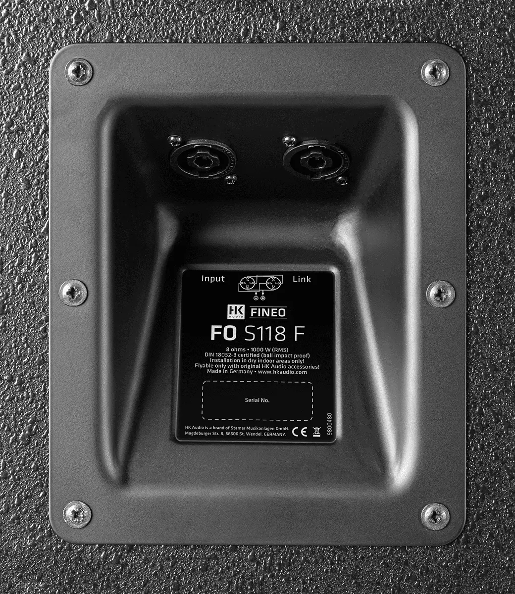 The FO S118 F is the flyable version of the particularly powerful FO S118 subwoofer. The 18" woofer with a 3" voice coil provides voluminous bass even for larger rooms and when the sound requires more noticeable boost in the lowest frequency ranges. The FO S118 F is an optimal complement for larger systems with FO 10, FO 12 and FO 15 loudspeakers. Despite the large membrane area, the FO S118 is compact and easy to integrate into various ambiences. Installation is simple and secure with the optionally available U- bracket or AP8 attachment points. Four M8 threads on the side and four M8 threads on the top are available for mounting. For aesthetic reasons, the FO S112 F does not have the cut-outs for cable routing or rubber feet. A secondary grille protects the bass reflex port from accidental or deliberate insertion of foreign objects. A ball-impact resistance certificate in line with DIN 18032-3 is provided for installations in sports facilities.