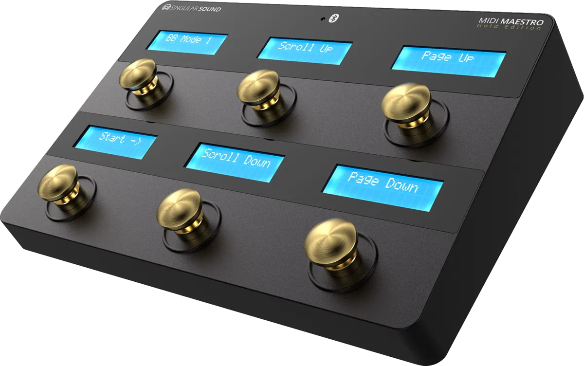 BeatBuddy mode.Selecting the dedicated Beat Buddy mode on your Midi Maestro gives you access to advanced features for more flexible control of your favourite drum machine. This mode allows hands-free navigation through the content, using the footswitches, and the ability to select out-of-order song parts, including skipping to the previous part. Within the Tempo function, you can choose the tempo of your rhythm via a tap tempo. You can also double the tempo or halve the tempo on the fly and simply return to the original tempo of your rhythm. The Accent function lets you add sounds such as claps, tambourine, bass drum, snare drum and hit-hats simply by pressing the corresponding footswitch, over and above the rhythm you're playing. Unlike using the BeatBuddy alone, you can stop the rhythm in playback with a single press (instead of two via the BeatBuddy alone).Aeros Looper Studio mode.The Midi Maestro has also been designed to enhance the control of your Aeros Loop Studio via a specially designed mode. This mode gives you hands-free access to song navigation and management (via the footswitches). Activating or deactivating a track is also made easy with a single press on the desired footswitch. It's also possible to play parts of songs out of order, but also to start a new track or part of a song with a simple press of the foot. So you have more flexible, targeted control over the actions you want to take to get the most out of your Aeros looper!Custom Midi mode.The Midi Maestro footswitch is also a simplified solution for controlling the full power of different Midi-compatible hardware. It allows musicians to dispense with the need to read long Midi manuals and get straight down to playing. The dedicated Midi Maestro mobile app features predefined controls, easy customisation and presets for popular devices. You have clear control over the actions requested via the integrated 6-screen display and the ten dynamic pages of Midi presets.