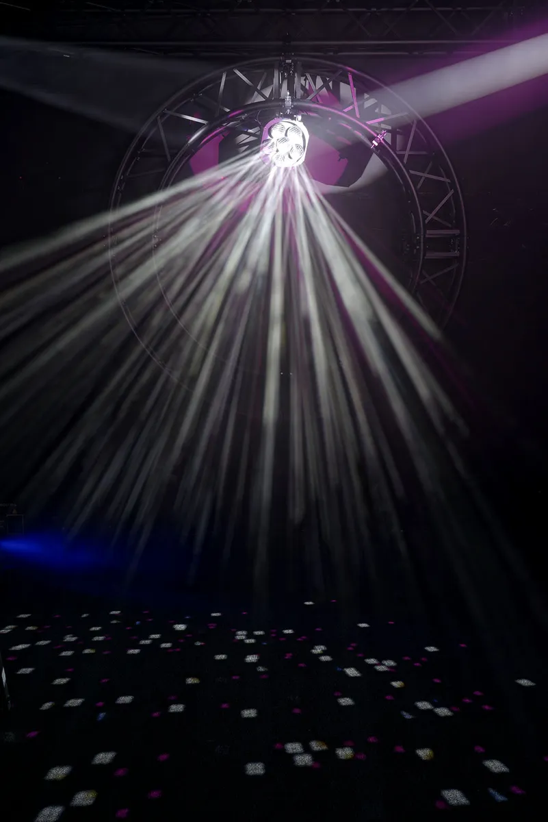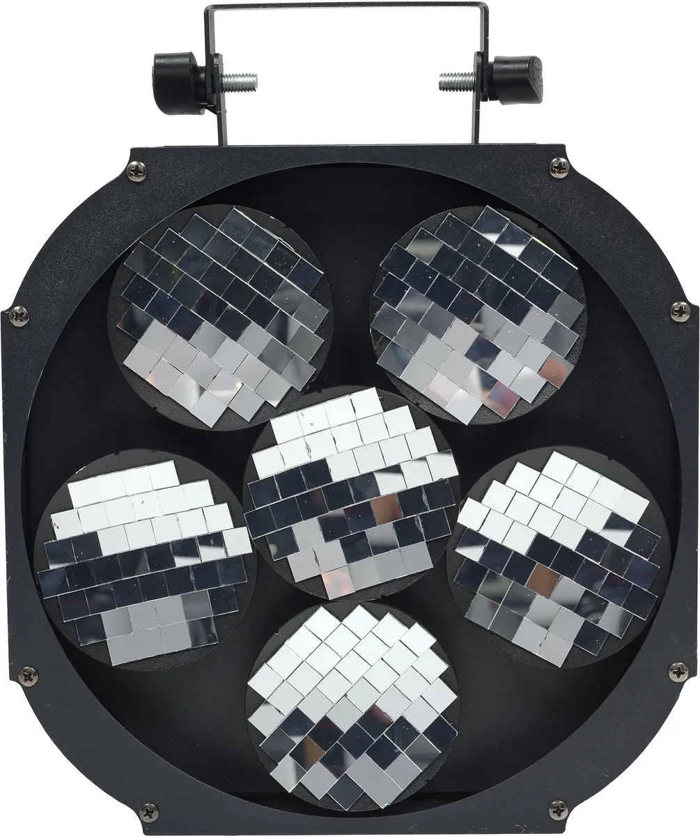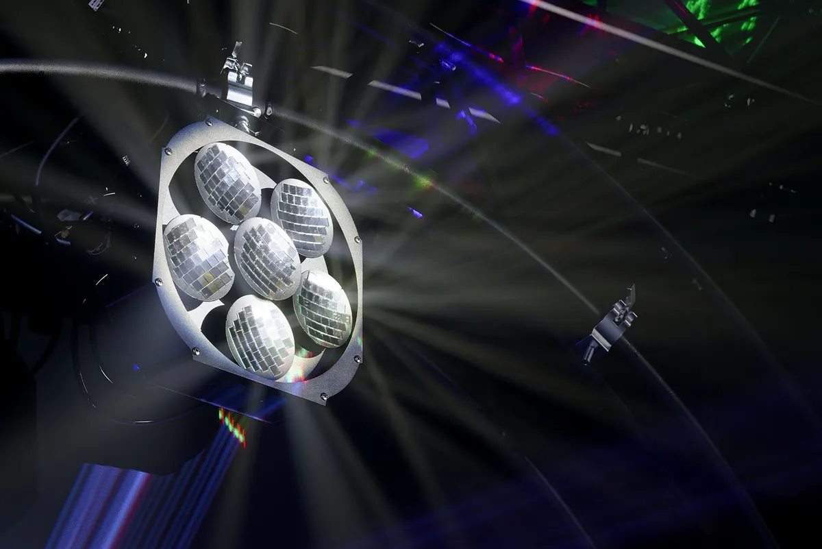 Step back in time to the greatest disco days with the Moving Mirror 6 disco ball effect developed by Algam Lighting! Featuring 6 rotating motorized mirrored discs, this revamped disco ball is perfect for unleashing the dancefloor in a flash. Simply aim a Spot or Beam moving head at the mirrors, activate the Moving Mirror 6's music detection mode and get the party started !A new twist on the disco ball!A must for every disco party and nightclub worthy of the name, the disco ball is certainly the most iconic effect of the 80s! With the Moving Mirror 6, Algam Lighting offers a revamped and revitalized version of this legendary effect. Consisting of 6 motorized, curved rotating discs covered with a mosaic of mirrors, capable of operating at different speeds and in opposite directions, the Moving Mirror 6 is capable of generating an impressive faceted ball effect, with moving patterns criss-crossing in space. Simply aim a sufficiently powerful and concentrated beam of light from a Beam or Spot moving head at the mirrors, and you're ready to party!Unpack, power up, dance!The Moving Mirror 6 has been designed to be ready for use in a matter of moments, thanks to its easy-to-use interface. Choose one of the two automatic modes or activate the music detection mode, point a beam at the mirrors, and you're ready to go! For more advanced users, the Moving Mirror can be precisely controlled via the 9 DMX channels available, allowing independent speed and rotation control over the 6 discs.