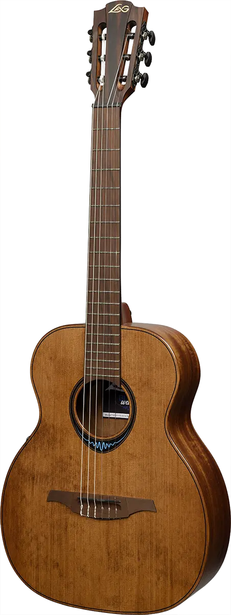 The Lag TNBW1TE-BRW brings a fresh experience to nylon string guitars by skillfully blending traditional and modern elements. This travel-shaped electro-acoustic guitar encourages players to dive into a rich and expansive tonal world.