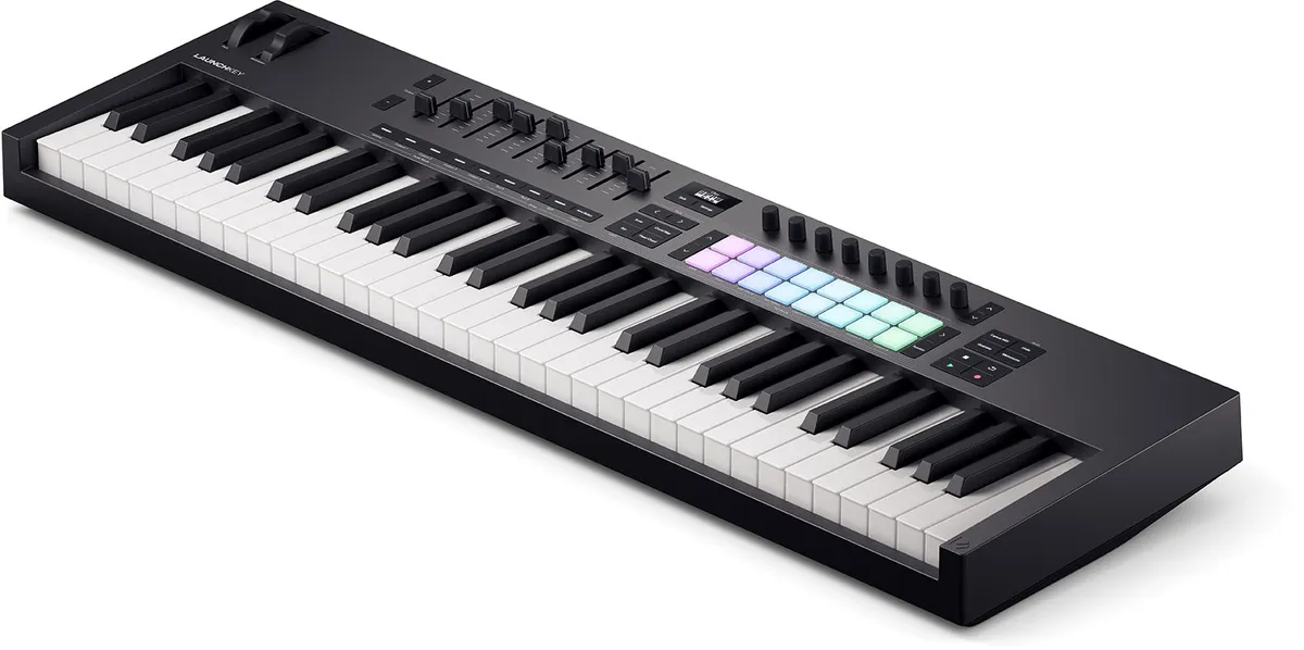 Launchkey 61 is a powerful DAW controller featuring a premium semi-weighted keybed, eight continuous encoders, nine faders, and 16 velocity-sensitive pads for playing drums, instruments, and launching clips. Designed for artists, the 61-key offers powerful DAW integration with a thoughtfully arranged control surface. Play instruments and drums, launch clips and scenes, and gain instant hands-on control over your DAW’s mixer, devices, and effects.