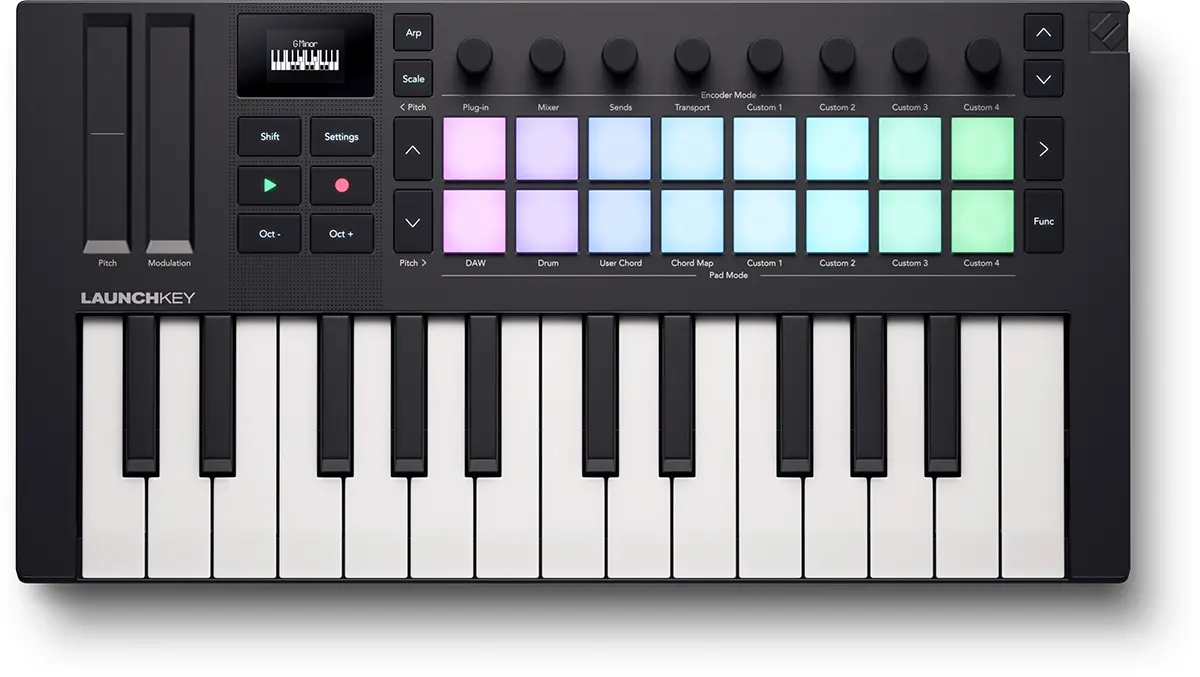 Play instruments, make beats, launch clips and scenes, and gain instant hands-on control over your DAW’s mixer, devices, and effects. Additionally, Launchkey features a unique, editable Arpeggiator, three Chord Modes for quick musical progressions, a Scale Mode to keep you in the right key, and a Chord Detector that displays the current chord on the OLED screen.