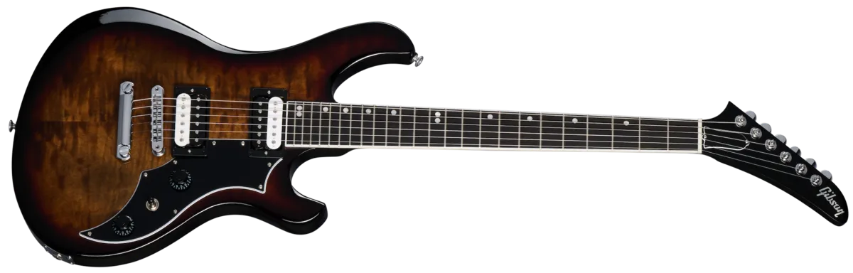 The new Gibson Victory Figured Top was created in response to Player requests for the return of this 80s-era cult favorite. Crafted for limitless self-expression. it carries the DNA of the original versions With enhanced features such as refined body contours. improved weight and balance, and an Explorer TU headstock. The Victory Figured Top has a 25.5" scale Iength, and the mahogany neck has an ebony fretboard With a compound radius for enhanced playability. a SlimTaperTM profile and 24 medium jumbo frets. The mahogany body has an AA figured maple cap. a Tune.O.MaticTU bridge. a Stop Bar tailpiece, and a gloss nitrocellulose lacquer finish, The highly flexible electronics include two 80s Tribute humbucker"•' pickups wired to push/pull master volume and tone controls for coil splitting and inner/outer coil selection 'Rhen the coils are split, which. along With the three-way pickup selector switch. deliver a Wide range Of humbucking and single coil tonal options With a minimum amount of controls. A Gibson hardshell case is also included.