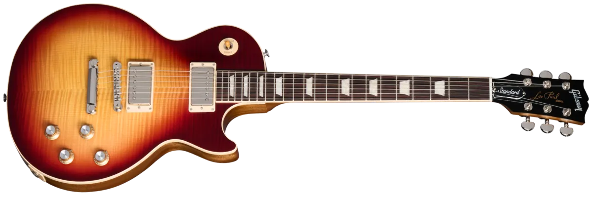 The new Les Paul Standard 60s Faded returns to the Classic design that made it relevant. played, and loved — shaping sound across generations and genres of music. lt pays tribute to Gibsons Golden Era of innovation and brings authenticity back to life. The Les Paul Standard 60s Faded features a satin nitrocellulose lacquer finish that gives it the 100k and feel Of a long-treasured musical companion_ lt has a Solid mahogany body With an AA figured maple top and a SlimTaperTV 60s-styIe mahogany neck With a rosewood fingerboard and trapezoid inlays_ lts equipped With an ABR-I Tune-O-MaticTU bridge. aluminum Stop Bar tailpiece, Grover@ Rotomatic 'Kidney' tuners, and gold Top Hat knobs With Silver Reflectors and Dial Pointers. The covered BurstbuckerTU 61R and 6 IT pickups are hand-wired to audio taper potentiometers and Orange Drop@ capacitors, A hardshell case is included.