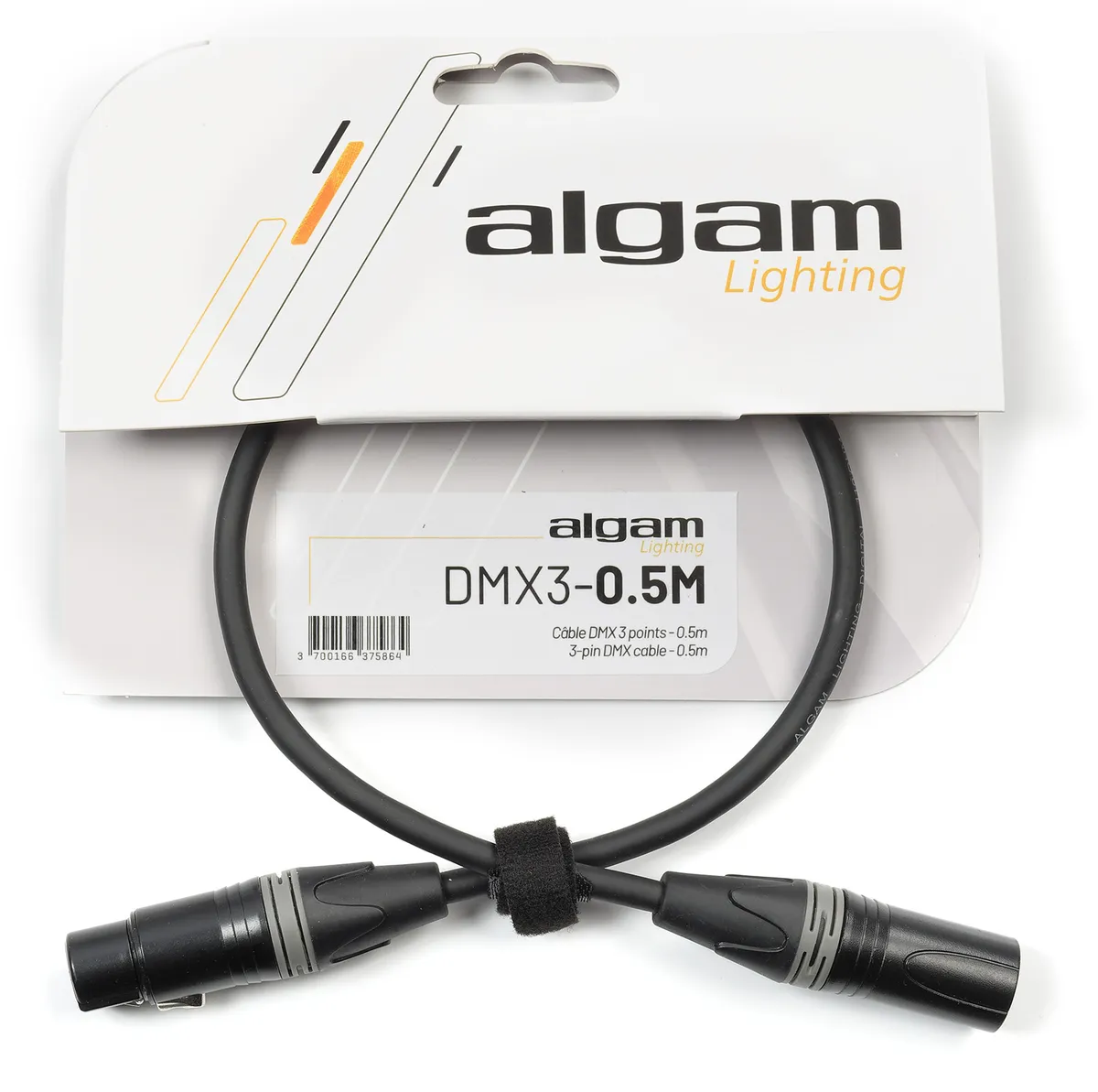This 0.5 m DMX 3-pin cable developed by Algam Lighting is the ideal solution for interconnecting your lighting machines, and making clean, discreet chains between systems installed on a stand or structure. Robust and reliable, it guarantees optimum DMX signal transmission thanks to its 110Ω impedance, while its 3-point connection makes it ideal for both amateur and advanced lighting systems.Control your DMX lighting systems with confidenceWould you like to control your DMX-interfaced lights with precision and put on your own light shows? This 3-pin DMX cable is an indispensable link between your DMX console and your lighting systems. Featuring 3-pin connectors suitable for most amateur and professional lighting systems, this robust and affordable 50 cm long DMX cable is perfect for interconnecting your light machines on a light truss or stand.Precise specificationsDesigned to meet the precise specifications required by the DMX protocol, this DMX cable offers a characteristic impedance of 110Ω via two 0.22 mm² conductors, enabling reliable and efficient DMX signal transmission in professional lighting installations.