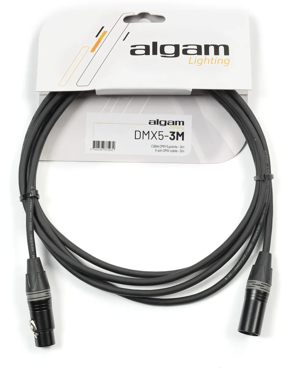 This 3m, 5-pin DMX cable developed by Algam Lighting is the ideal solution for connecting your DMX console to your lighting machines, or for creating chains between machines on a stage or structure. Robust and reliable, it guarantees optimum DMX signal transmission thanks to its 110Ω impedance, while its 5-point connection makes it ideal for professional lighting systems.Control your professional lighting systems with confidenceThis 5-pin DMX cable is an indispensable link between your DMX console and your various lighting systems. Featuring 5-pin connectors suitable for professional lighting systems, this robust and affordable 3-meter-long DMX cable is perfect for interconnecting your lighting machines at your shows and events.Precise specificationsDesigned to meet the precise specifications required by the DMX protocol, this DMX cable offers a characteristic impedance of 110Ω via two 0.22 mm² conductors, for reliable, efficient DMX signal transmission in professional lighting installations.