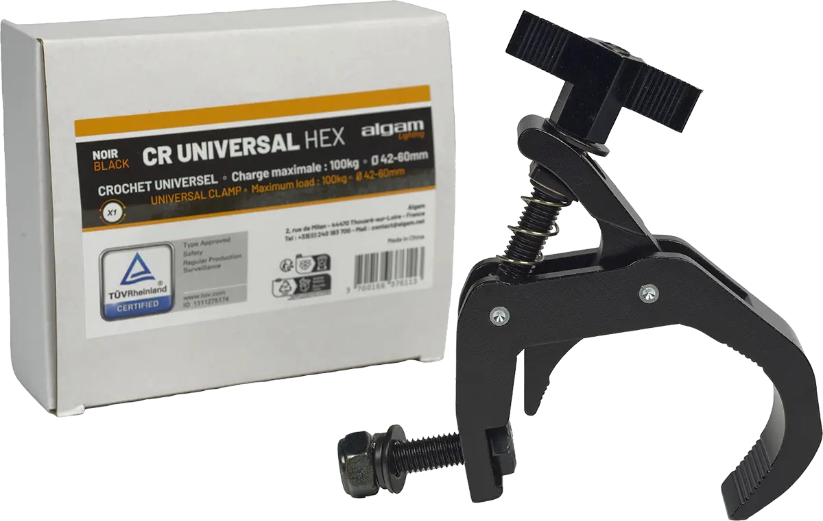 The CR-UNIVERSAL HEX is an aluminium clamp for structures, ideal for services and installations. Designed to hook onto structures with cross-sections ranging from 42 to 60 mm, this versatile universal hook has a maximum load capacity of 100 kg and can be tightened using a lock nut.