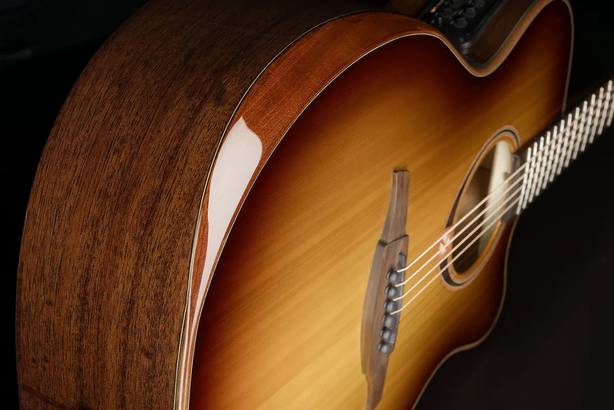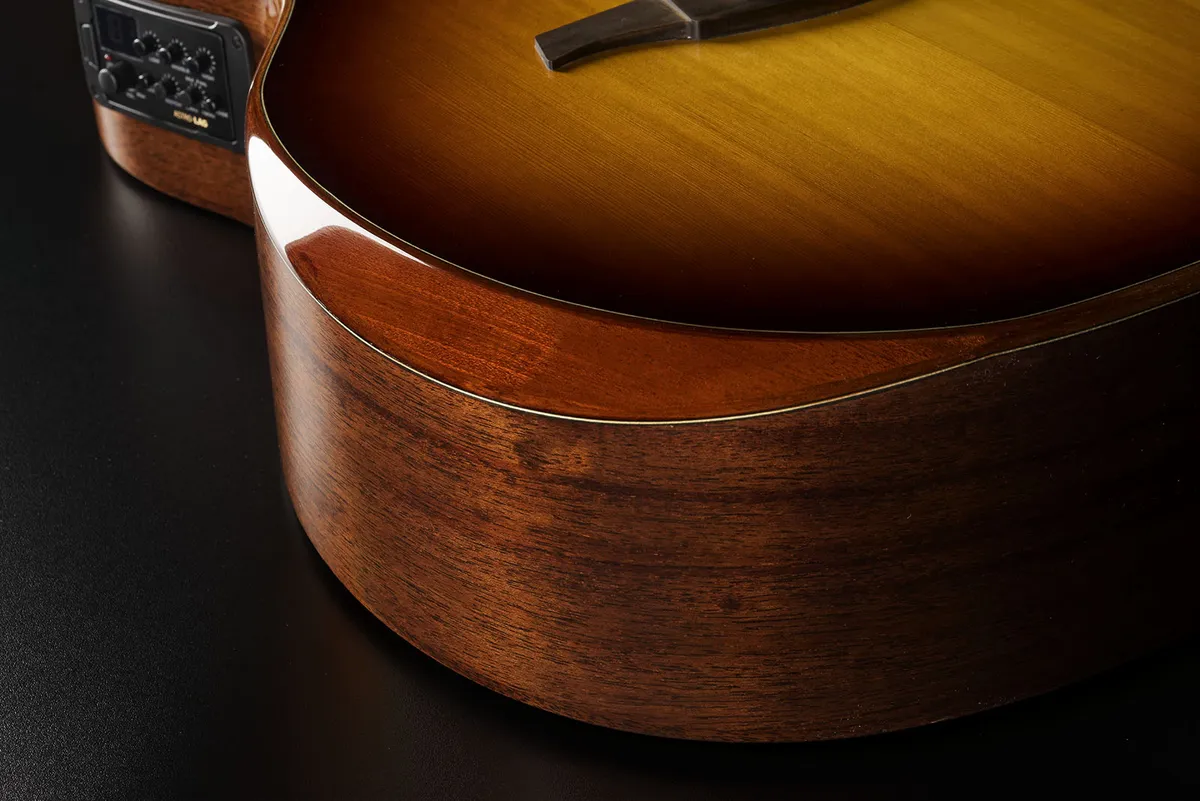 The Tramontane 118 series is defined by the stunning combination of a solid red cedar top and a Khaya mahogany body. The bevel, crafted from the same mahogany as the bindings, stands out beautifully against the two finishes of this special edition: Black and Brown Shadow, both enhanced by a high-gloss finish of exceptional quality.